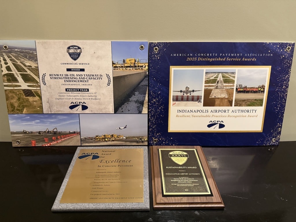 As part of their 2025 Excellence in Concrete Pavement Awards series, the American Concrete Pavement Association (ACPA) highlighted the Indianapolis International Airport’s Runway 5R-23L and Taxiway D Strengthening and Capacity Enhancement project. Winning a Gold Award in the Commercial Service category, Best in Show for Sustainability, and the Resilient/Sustainable Practices Recognition Award, this project was a $250+ million redesign of the airport’s 10,000-foot-long southern primary runway and parallel taxiway system that set a precedent for airfield transformations.