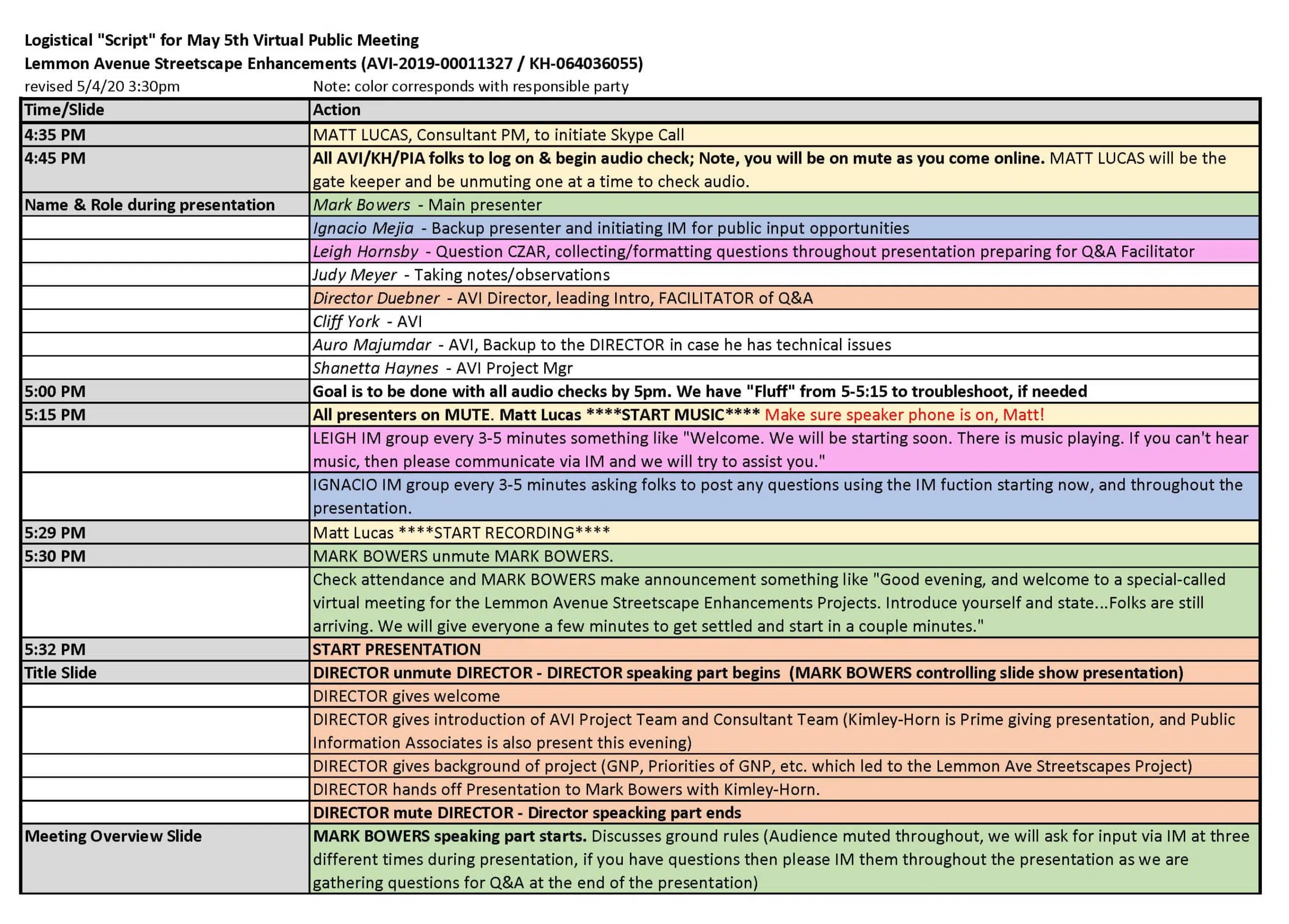 Try using a color-coded spreadsheet like the one shown below to break down everyone’s roles minute by minute. We assigned someone to be the voice of the presentation and control the slides. The Airport director was asked to speak at the beginning of the presentation and at the end. We also had someone else manage the music and muting controls. To gain feedback through instant messaging, we had someone monitor responses as attendees chimed in. They explained how to use the instant messaging tool, and the slideshow included a visual guide. We sent frequent reminders to attendees via the instant message box that microphones were muted and they needed to post responses in the chat tool. To address any technical issues, an IT teammate joined the meeting.