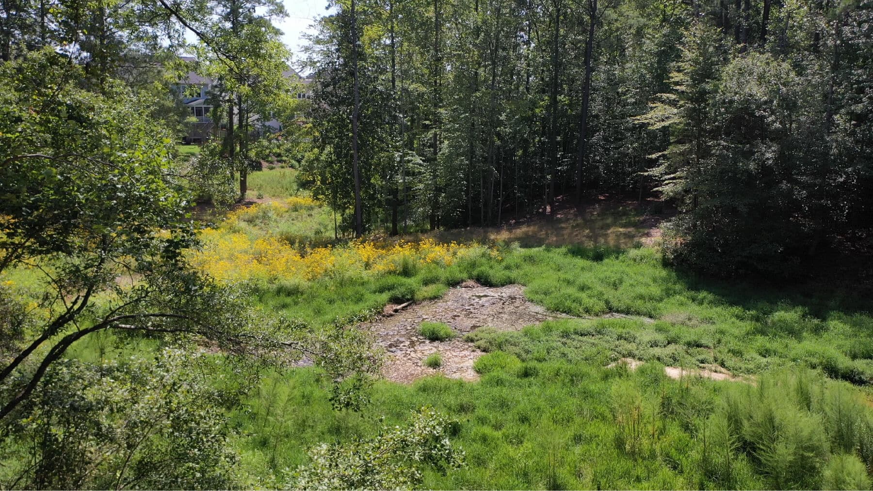 Achieving these goals required restoring approximately 500 feet of stream within the existing pond and dam footprint, and creating a small floodplain wetland within the footprint of the former pond. Kimley-Horn conducted wetland, stream, and riparian buffer delineations, field verification meetings, and stream restoration design services. Our team of engineers worked closely with contractors and the Town of Wake Forest to reshape channels, build grade control structures, create bank stabilization, and plant native vegetation. Approximately 340 linear feet of stream and 0.4 acres of wetland were restored.
