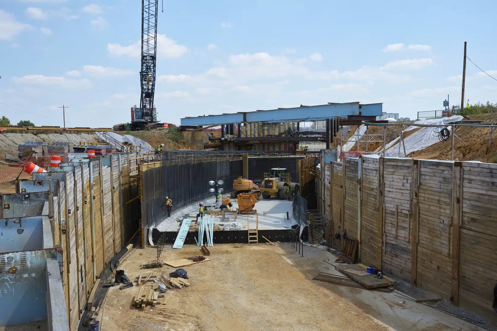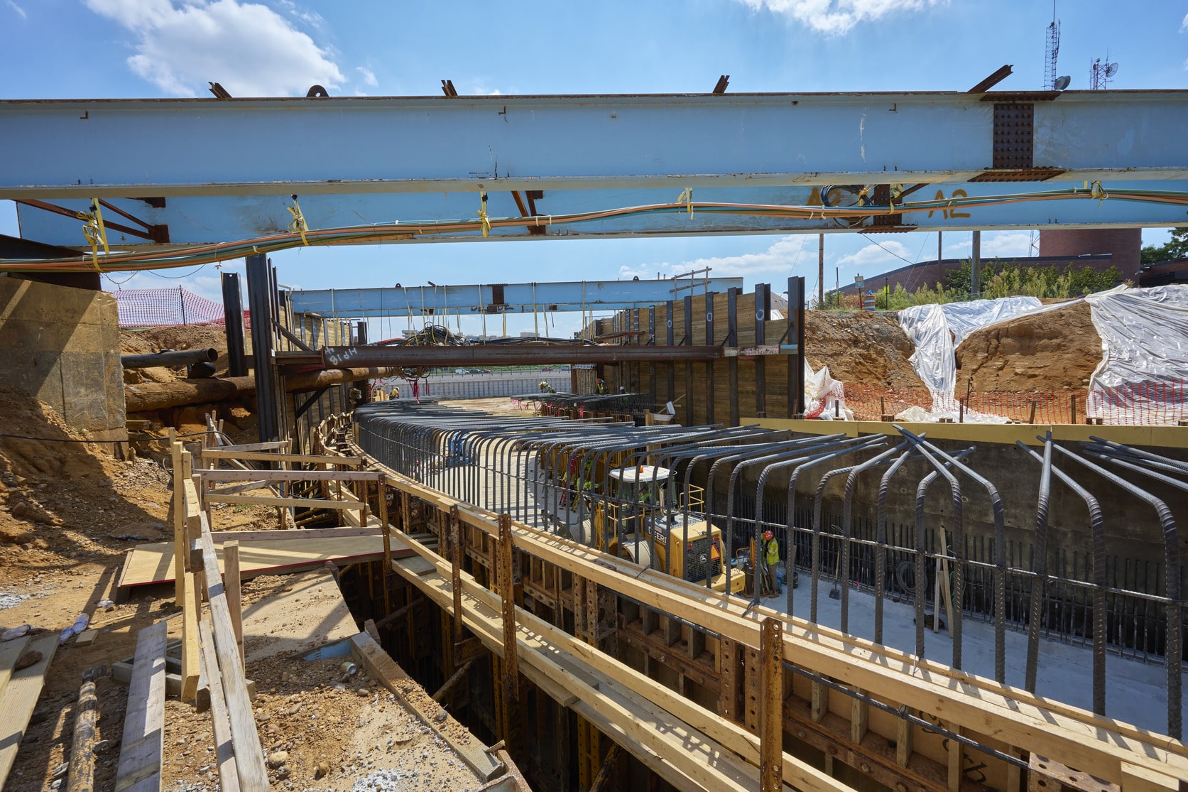 Construction of the Cemetery maintenance access tunnel in 2023 with utility lines visible above the trench.