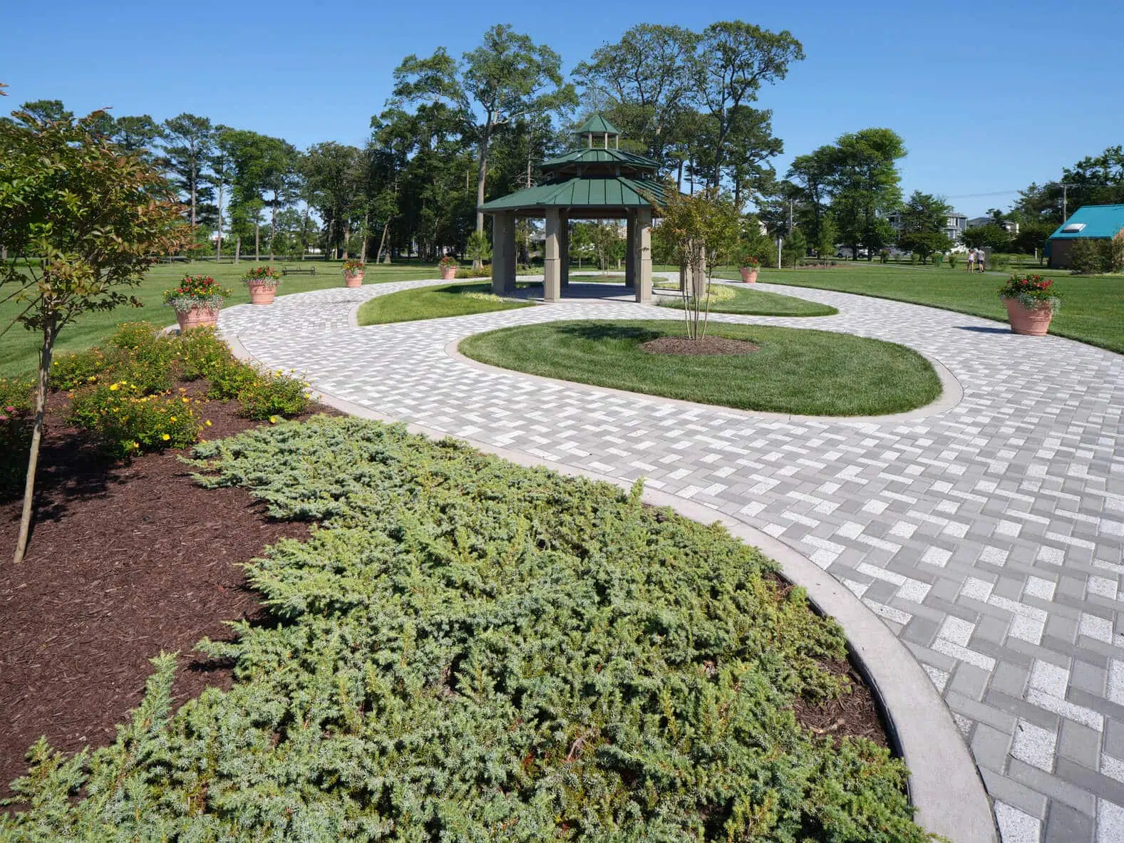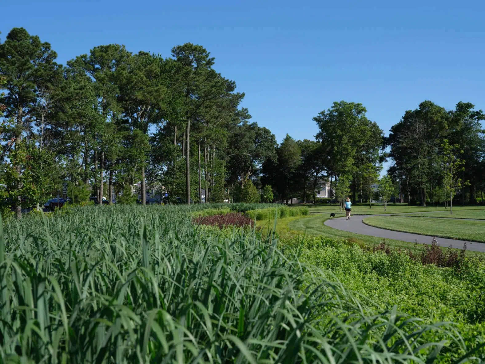 Throughout the park, there are 0.75 miles of walking paths which include side pathways off the main large oval pathway. Between each pathway, there is light landscape mounding to create a visual change to the otherwise level site. This mounding helps to develop an illusion of seclusion by breaking up the major open spaces with smaller adjunct areas. Around the open lawns in the lower area of the park are beautifully planted rain gardens that collect stormwater from the entire park.