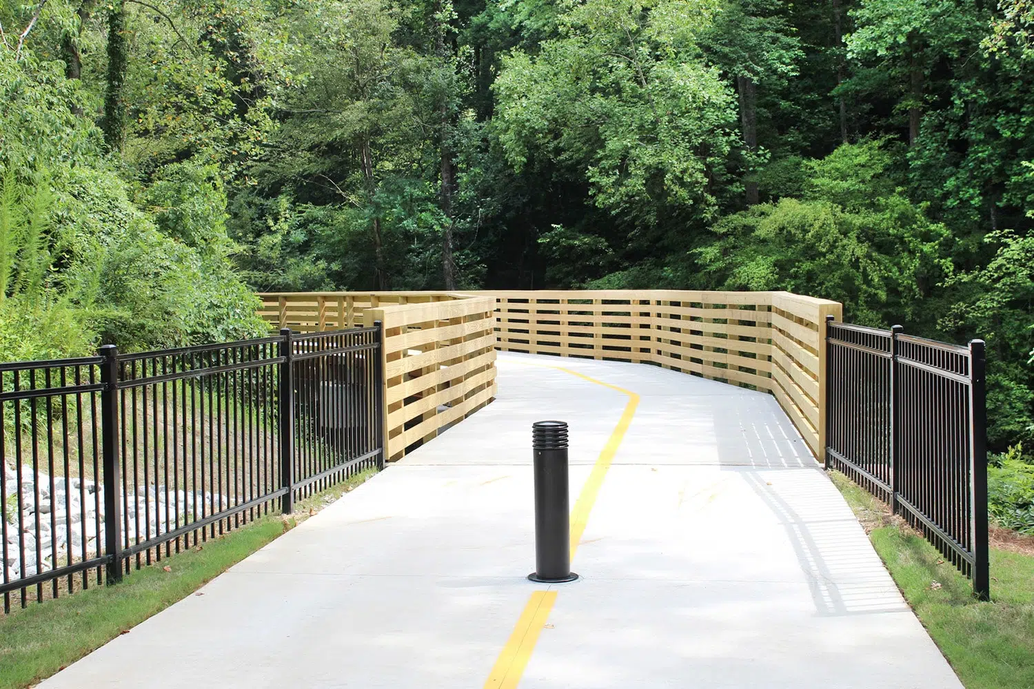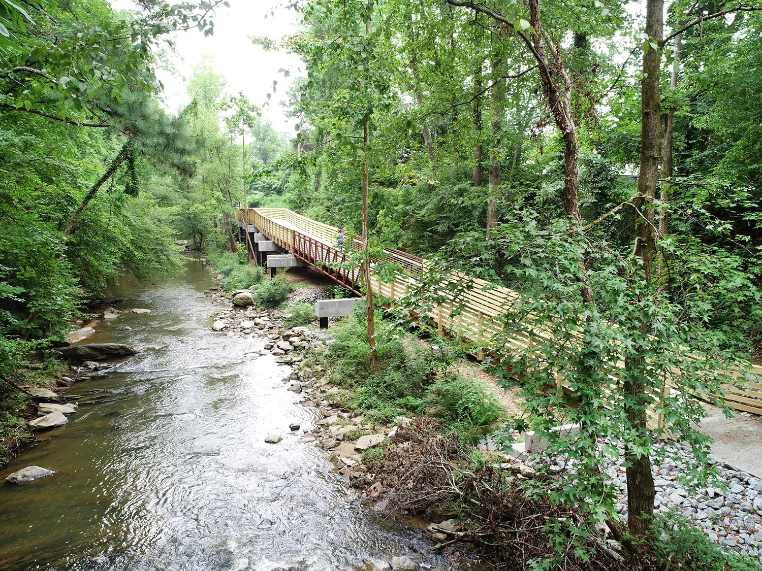 Constructed along Rottenwood Creek, the project faced multiple challenging constraints including a narrow floodplain, a thick, mature tree canopy, a Cobb County trunk line sewer, and an existing transcontinental gas pipeline. Kimley-Horn’s design used a combination of at-grade paved trail and elevated boardwalk to minimize fill in the floodplain and provide an accessible route through the steep, rocky terrain. The at-grade trail sections use pervious concrete pavement to minimize impacts within the stream buffer and reduce stormwater flows. A variety of foundation systems were also used to help the contractor adapt to unforeseen subsurface conditions during construction. Additionally, the trail was designed to allow for emergency access by Cobb County first responders per the American Association of State Highway and Transportation Officials (AASHTO) and Cobb County DOT requirements.