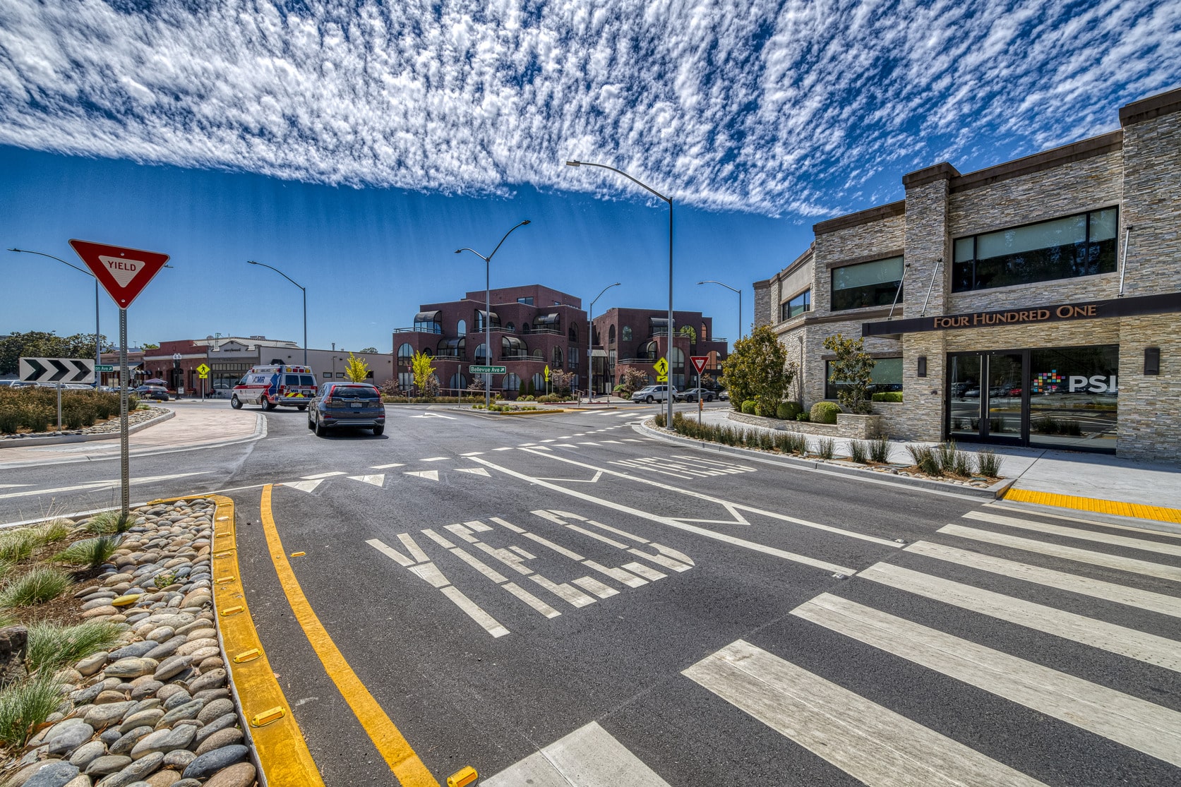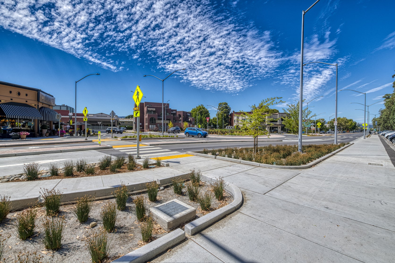 California Drive is a regional route that parallels Highway 101, and the intersection serves as a gateway into the City’s downtown. Parking for downtown is across California Drive and a nearby high school creates a significant number of pedestrians crossing California Drive. The existing crossing was adjacent to a bus stop and required pedestrians to cross four lanes of high speed traffic. With the traffic-calming roundabout in place along with enhanced pedestrian crossings that included high visibility striping, rectangular rapid flash beacons (RRFBs), and pedestrian refuge islands, pedestrian safety has been greatly enhanced at the intersection.