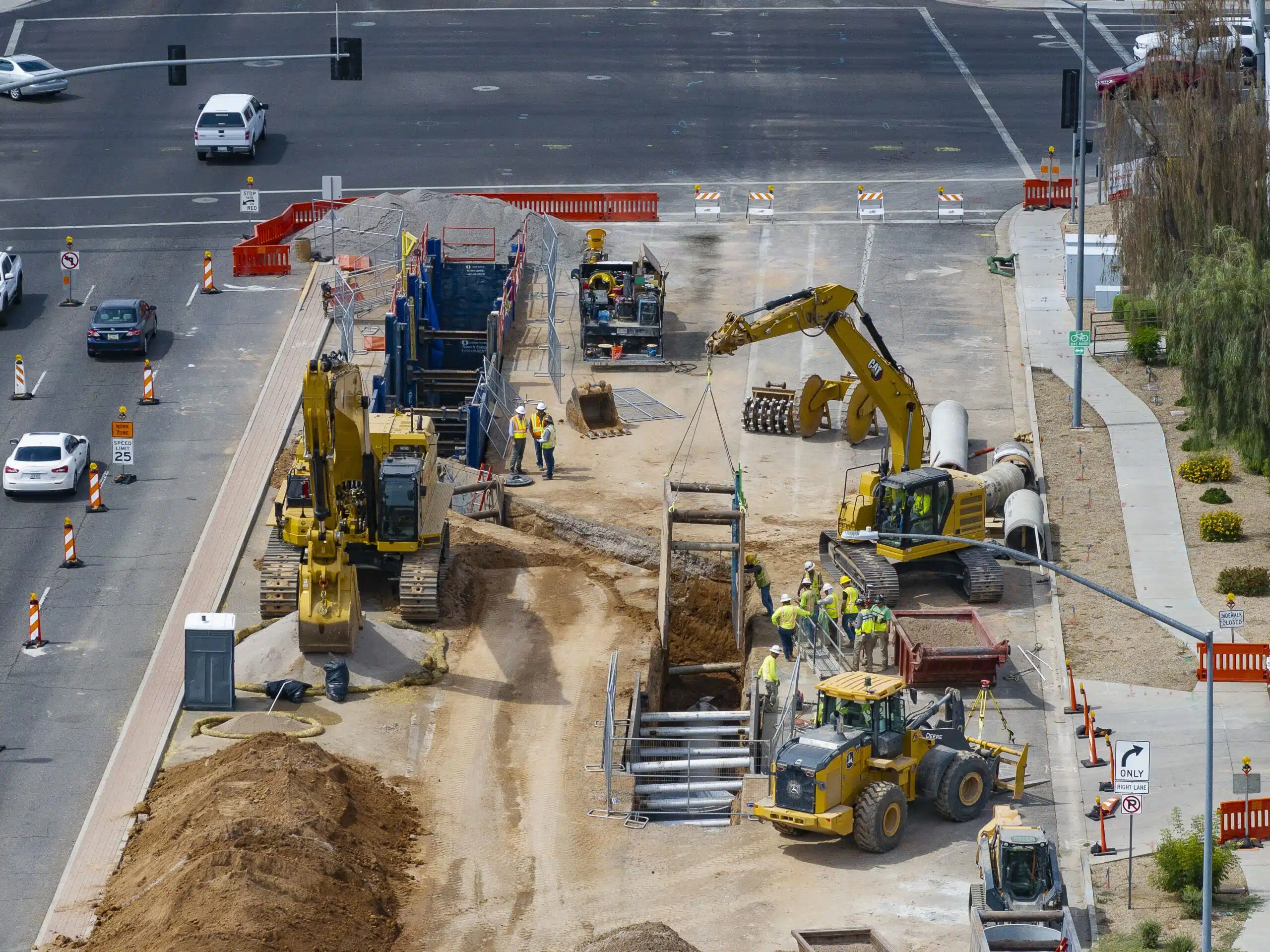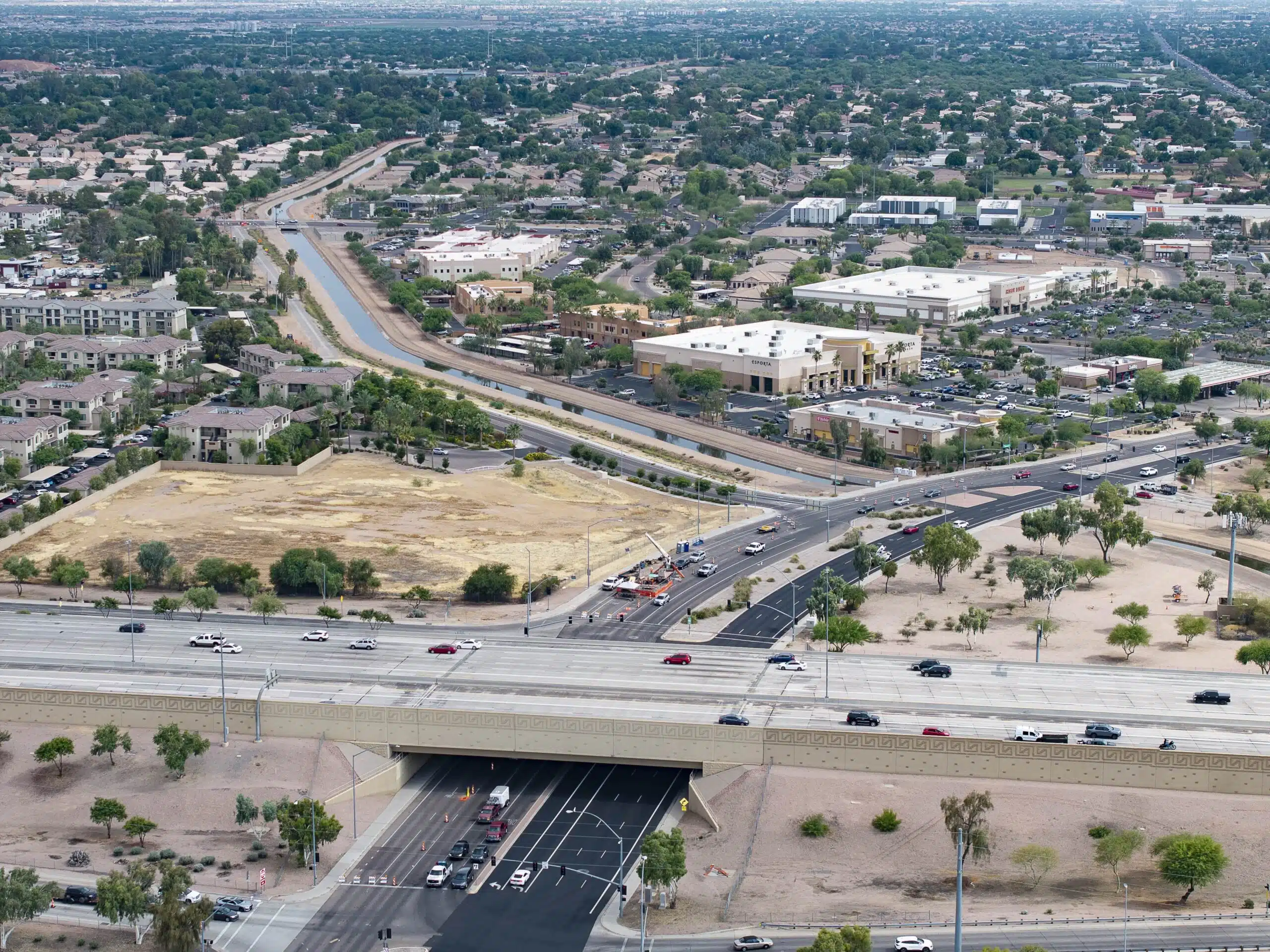 Our team used Synchro to model how construction activities would impact traffic on the freeway’s on- and off-ramps and coordinated with ADOT to determine how to minimize mobility challenges. With support from the City of Mesa, we also strategized how to allow space for construction—including trenchless technology installation methods like jack and bore that used a steel casing in addition to liner plate placement.