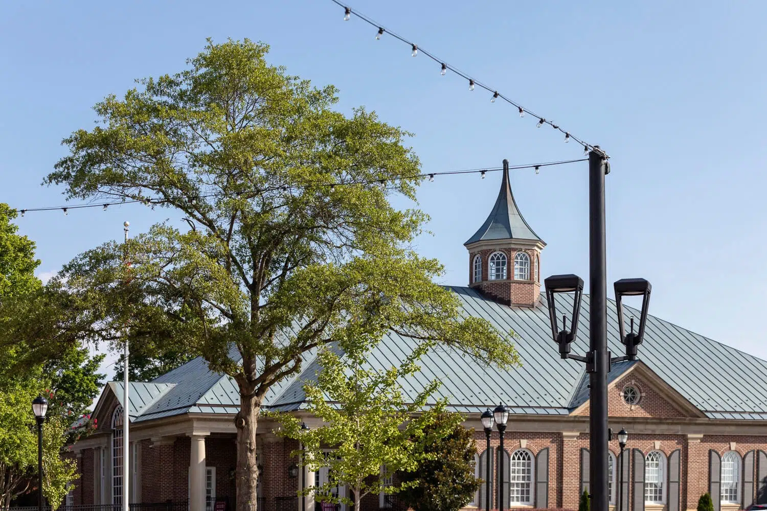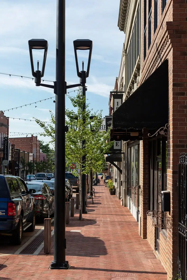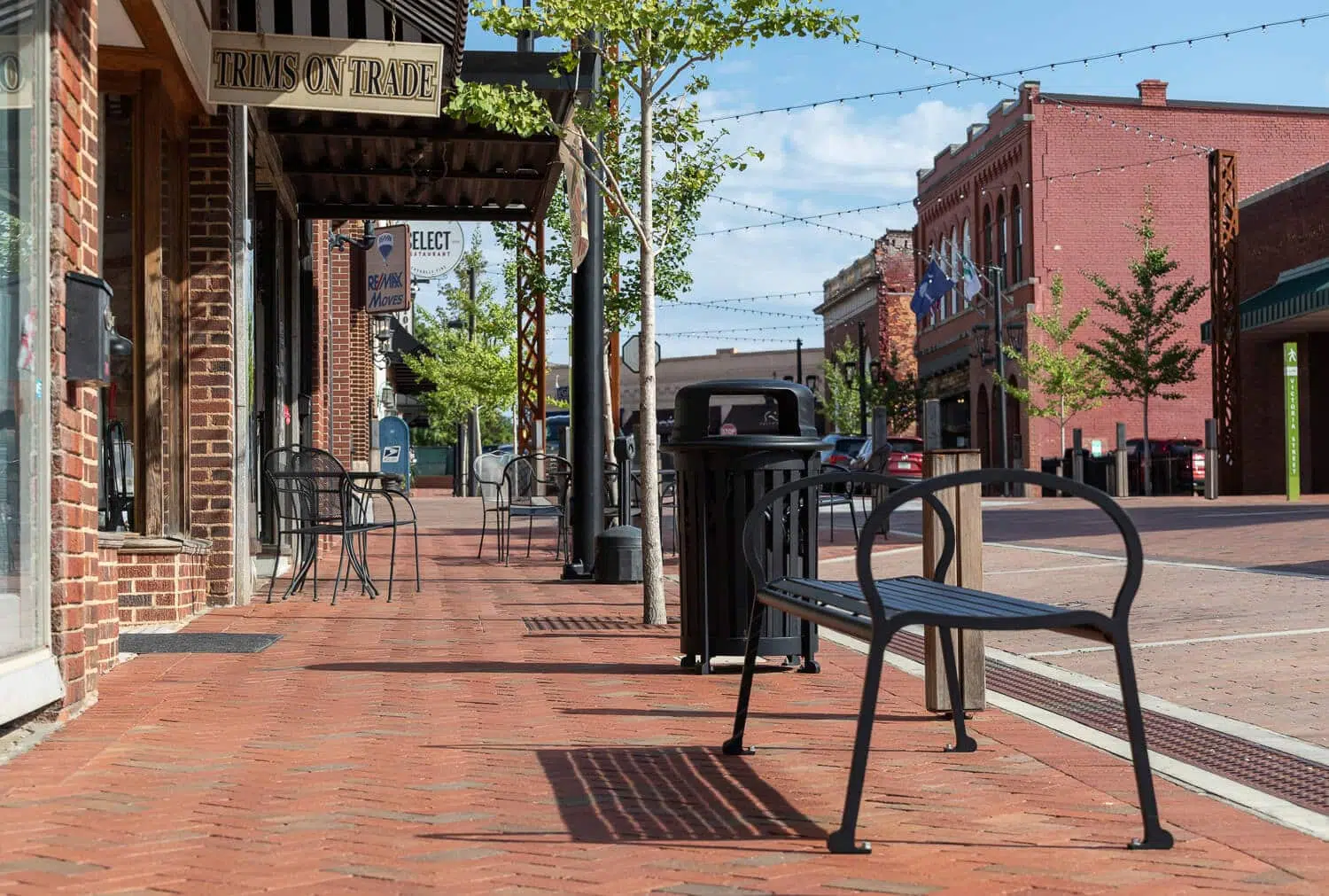 A distinct challenge when developing Trade Street to a mixed-use environment was maintaining daily parking and pedestrian access to local businesses. Subconsultant and local civil engineering firm, CoTranCo, prepared the final roadway design drawings with no curb separation, allowing Kimley-Horn to use trees, bollards, street lighting, and seating elements to shield pedestrians from motorists. To ground the street in its historic beginnings, Kimley-Horn partnered with street furnishings manufacturer Landscape Forms to design custom street lighting that would emulate the gas lanterns that once lined the street. A canopy of modern festival lights crisscrosses the street overhead, structurally supported by tension cable.