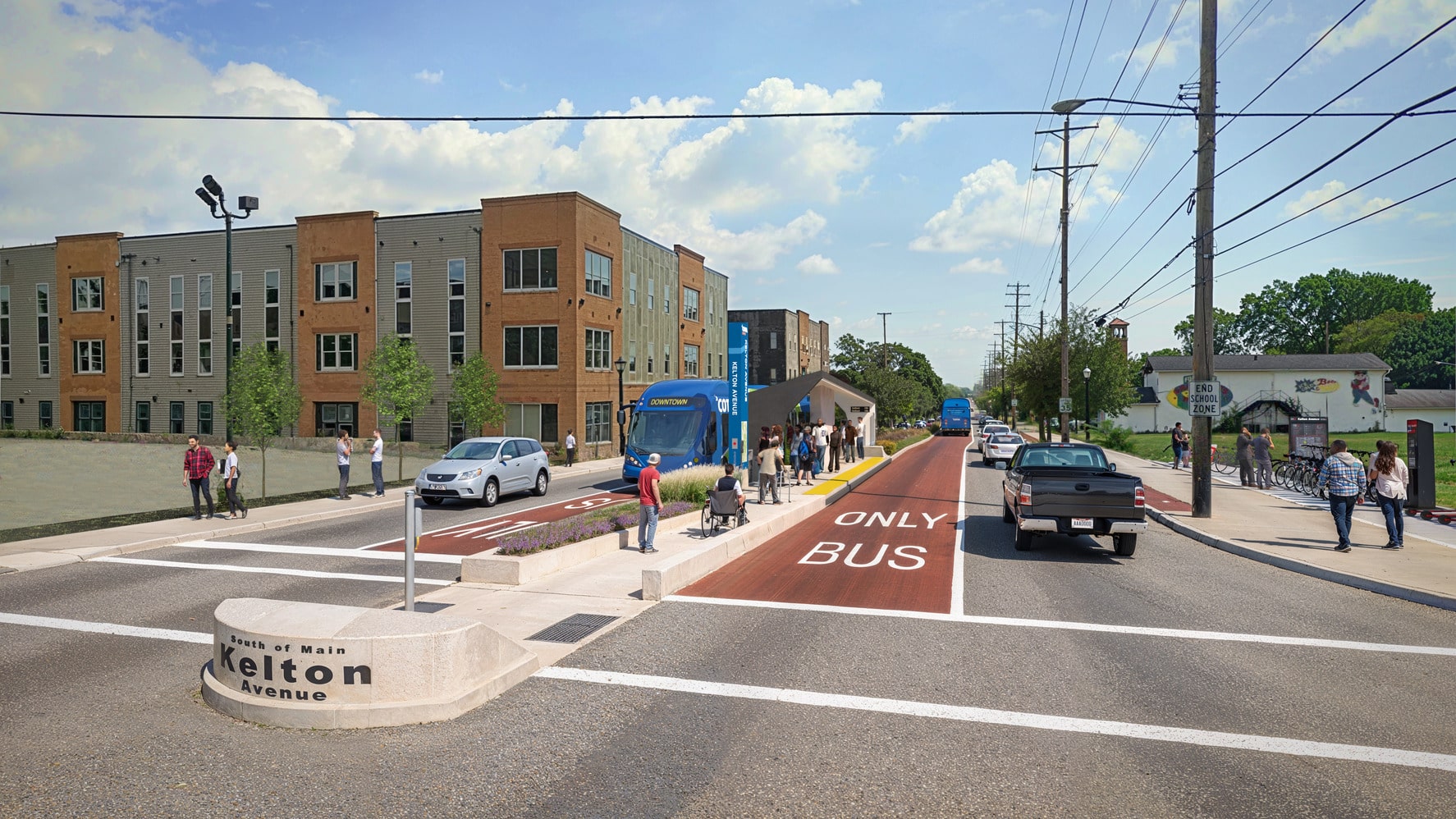 Planned station and roadway design to accommodate zero-emission BRT vehicles that will fit more people, improve transit travel speed and reliability, and enhance passenger station experiences