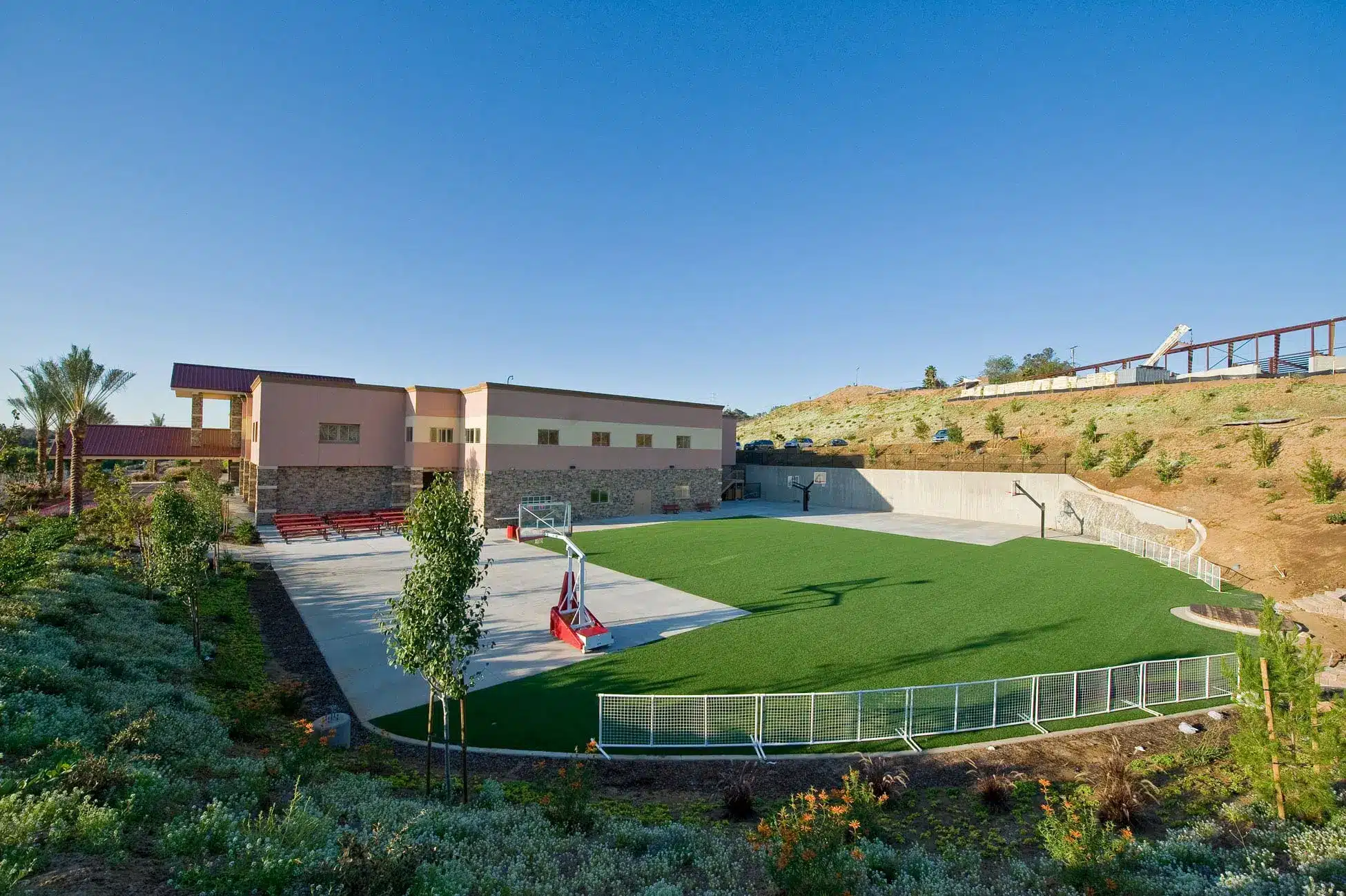 The scope of the project was the transformation of a 14.6 acre hillside site into a new home for the Escondido Seventh Day Adventist Church and Academy. The 55,620 square-foot church building sits atop the site and has views over the Escondido terrain. The 77,300 square-foot two story school building rests below the church and is surrounded with recreational areas for kindergarten and elementary students. A soccer and softball field for high school students is carved into the northern portion of the site. In all, the site work required massive re-grading and retaining up to 35’ high walls in some areas.