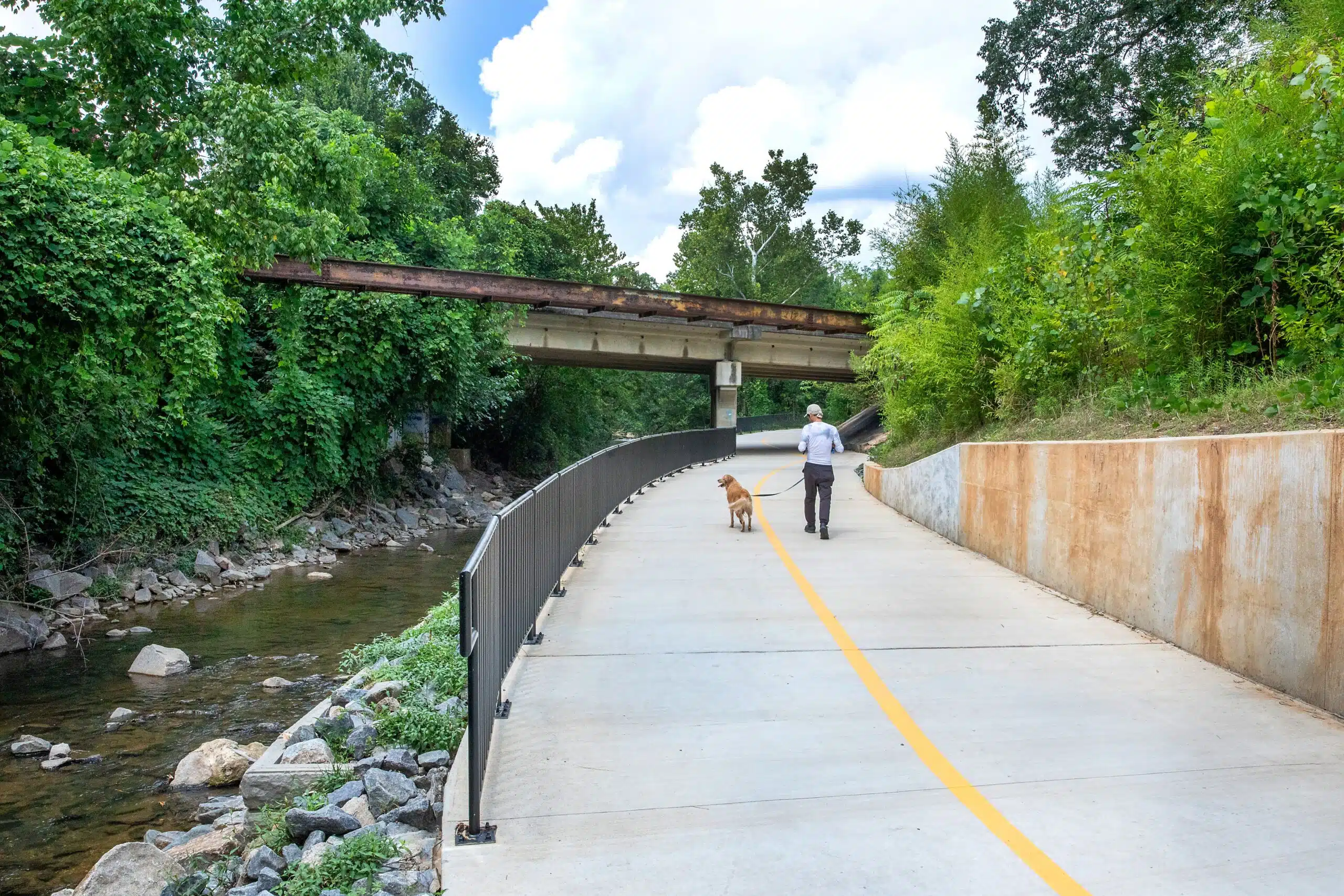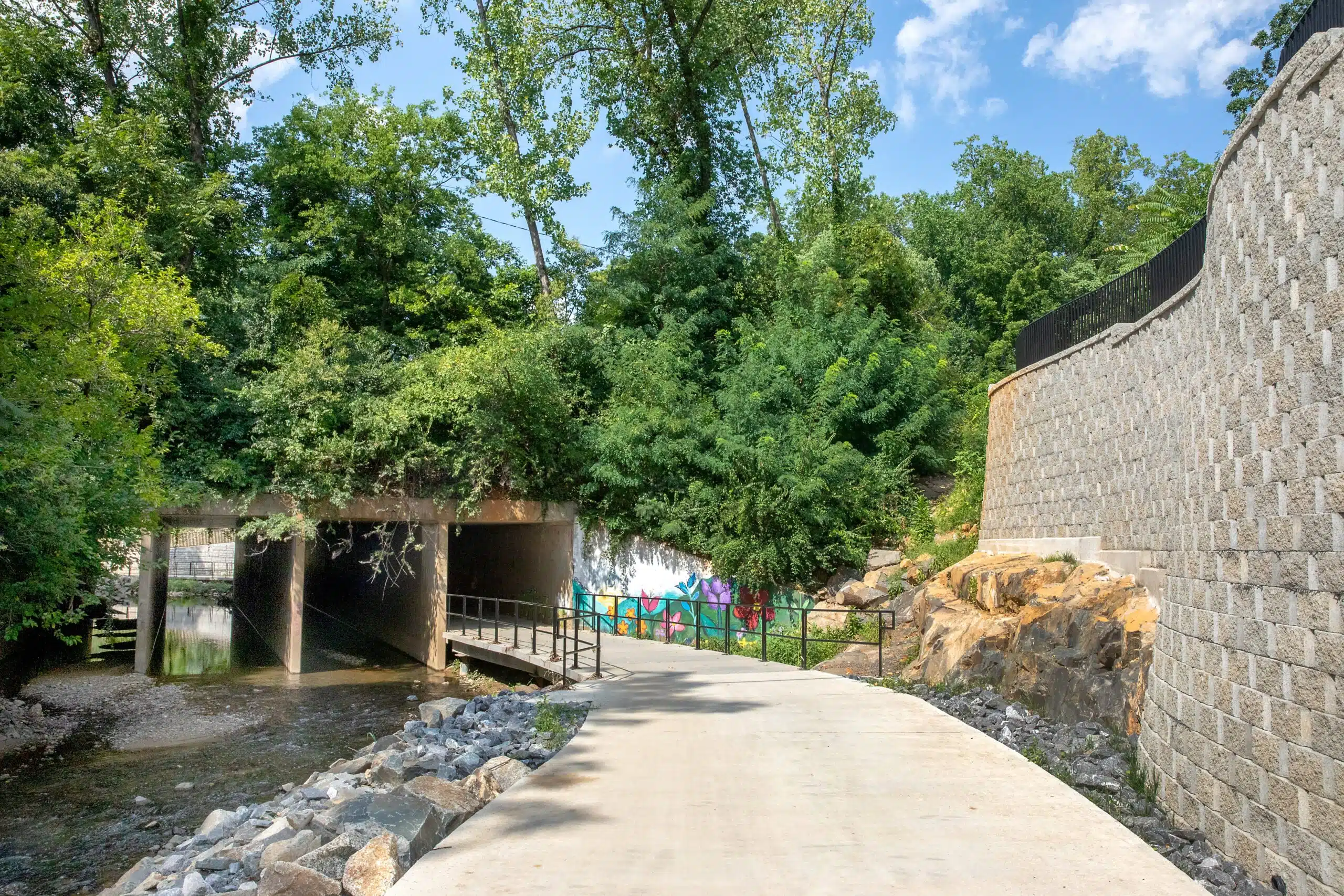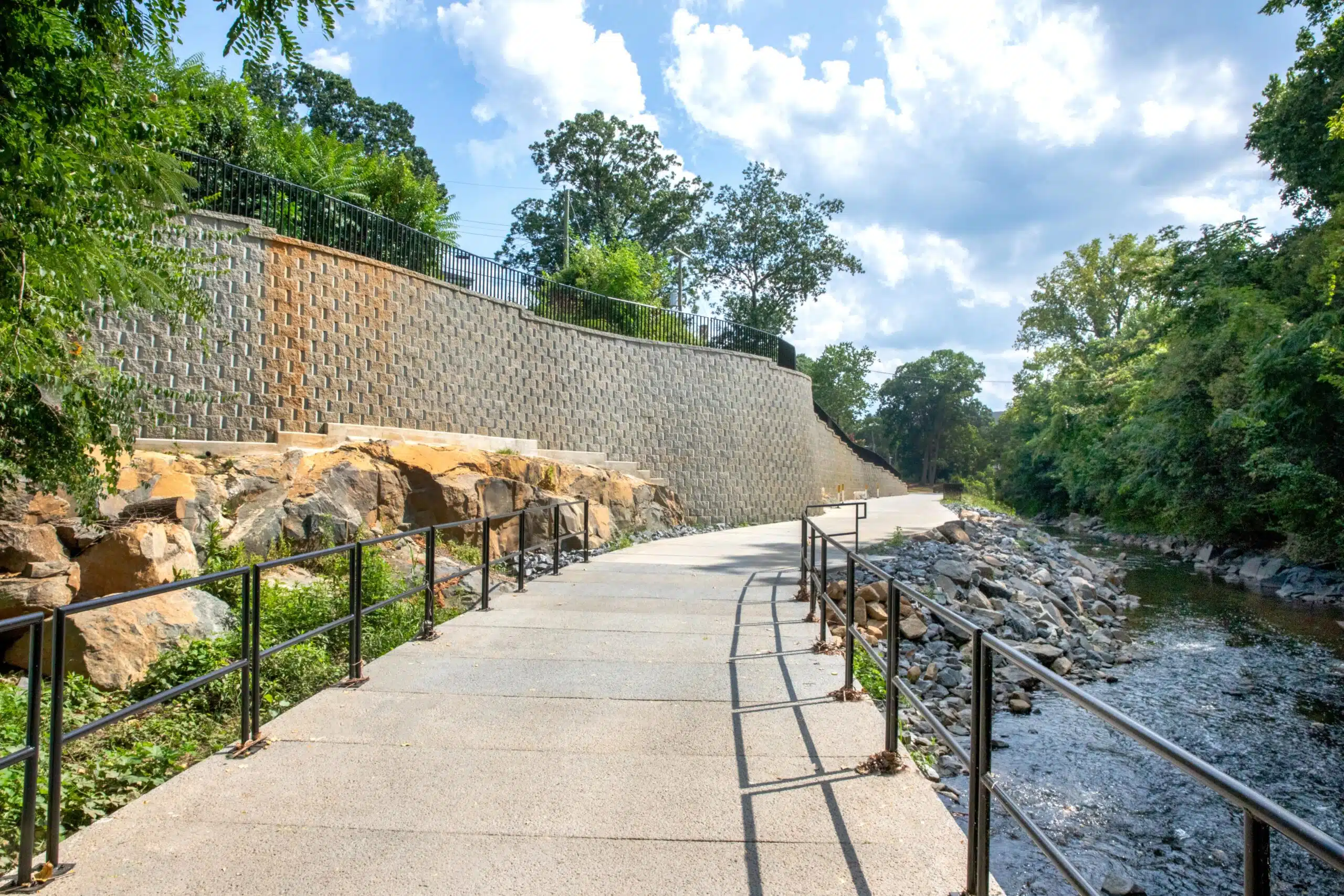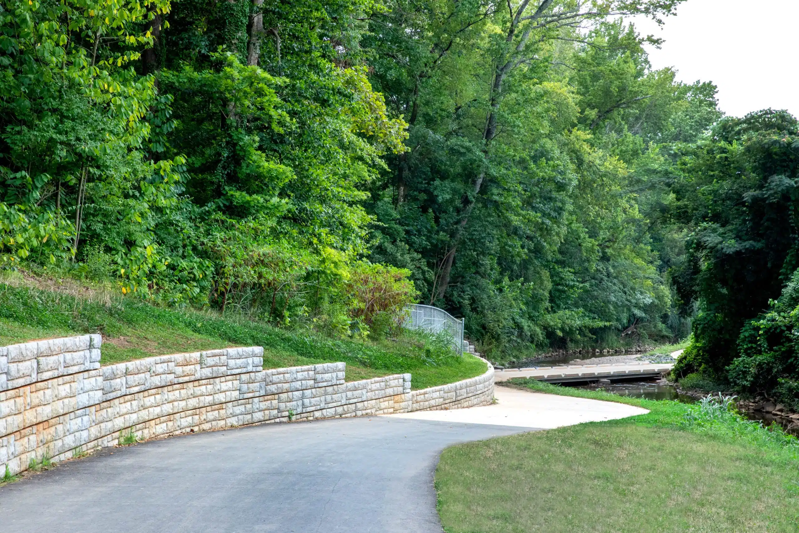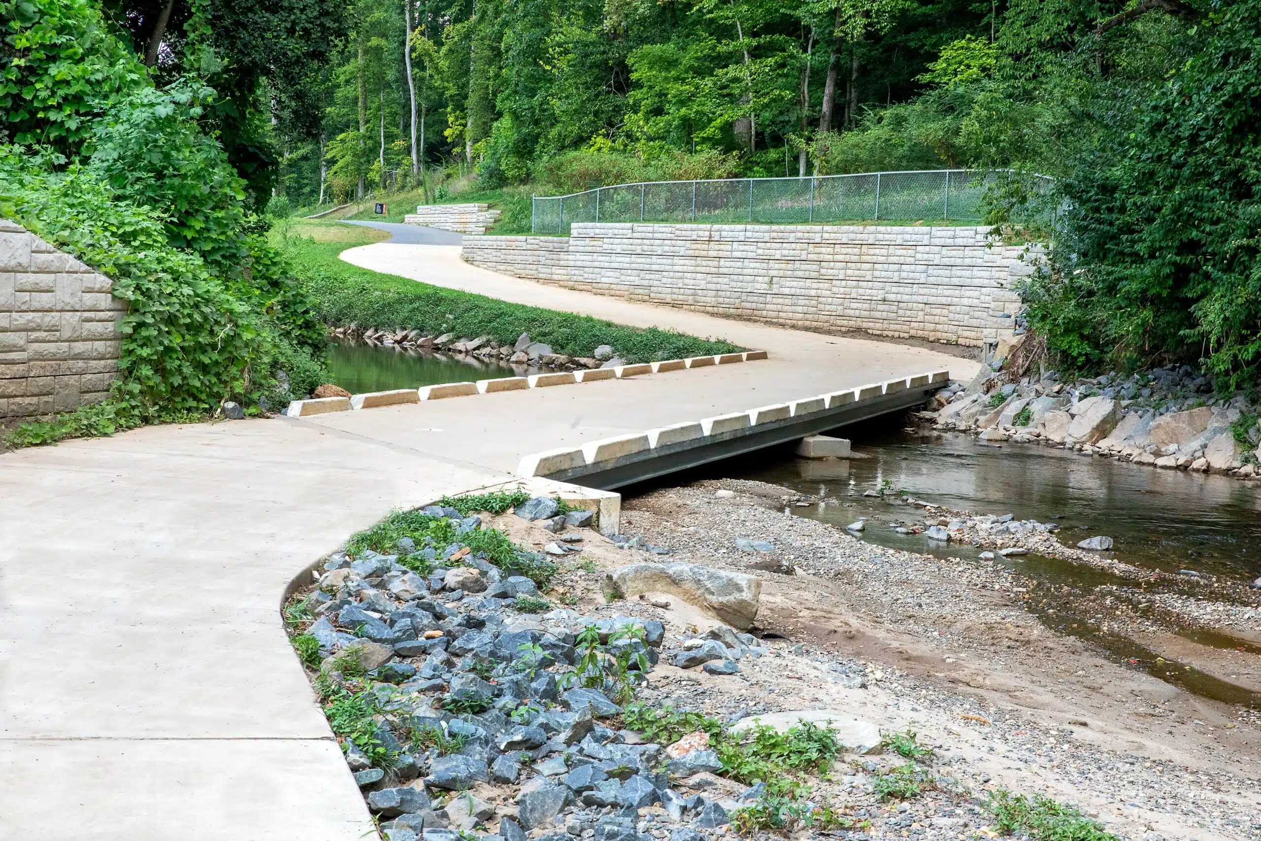 The Cross Charlotte Trail team leveraged a variety of structural designs to provide a stable pathway for travelers. For instance, 25 retaining walls of different heights and styles were created for the Brandywine to Tyvola Road segment. Additionally, a prefabricated pedestrian bridge was added over a Little Sugar Creek tributary.