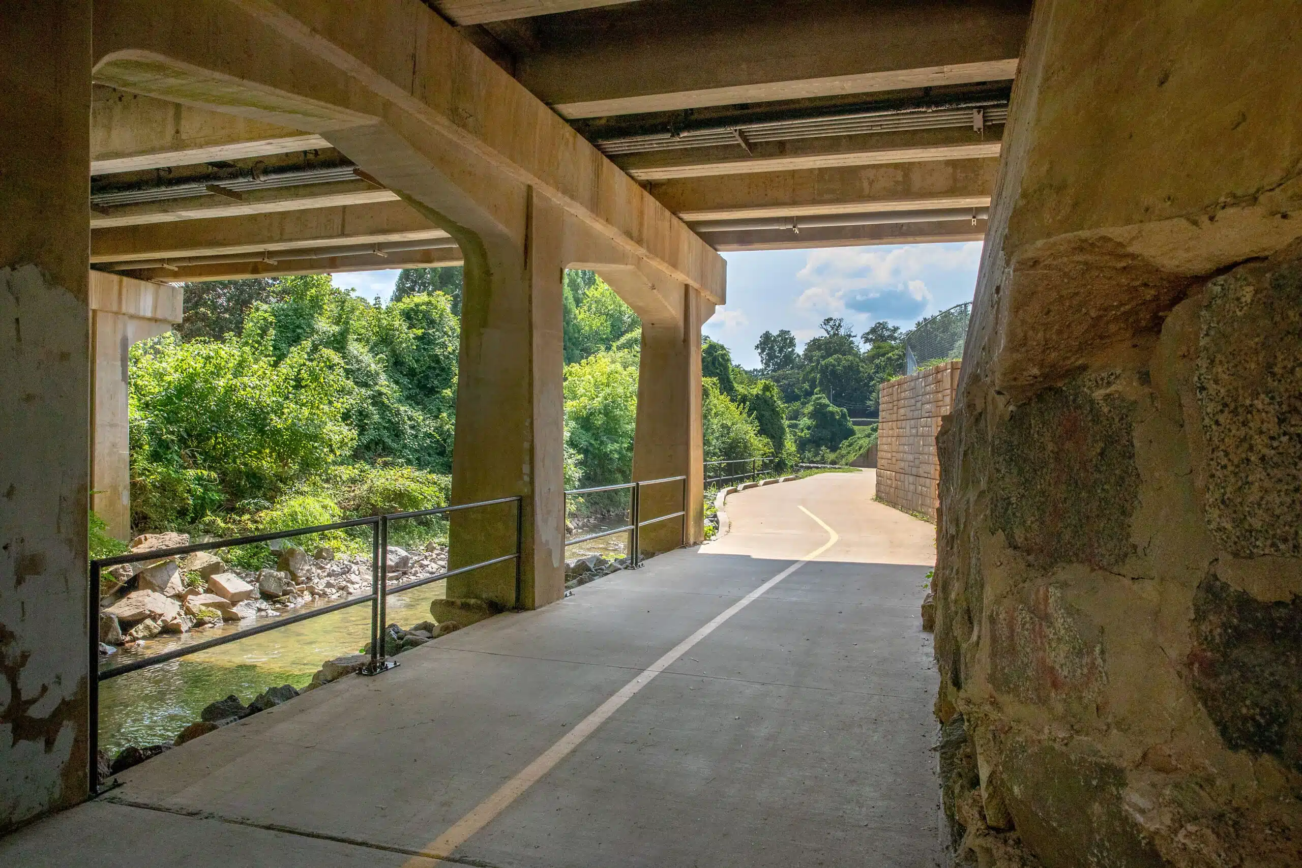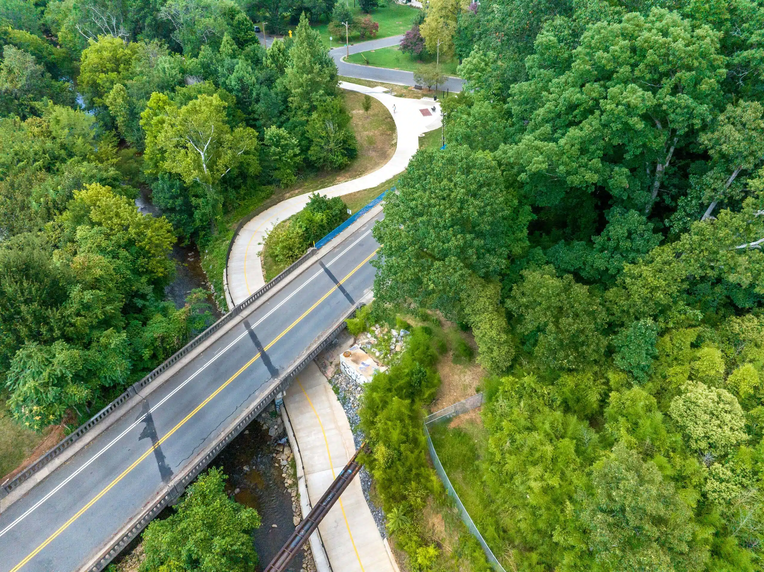 Different areas of the planned trail were intersected by aerial water and sewer lines and underground utility pipes, including a 48-inch water main running under Little Sugar Creek and alongside one of the roadway underpasses. Our team coordinated with Charlotte Water to create a trail alignment that avoided major impacts to this water main. The final design placed trail infrastructure above and beneath the water main so Charlotte Water could easily access it for maintenance.