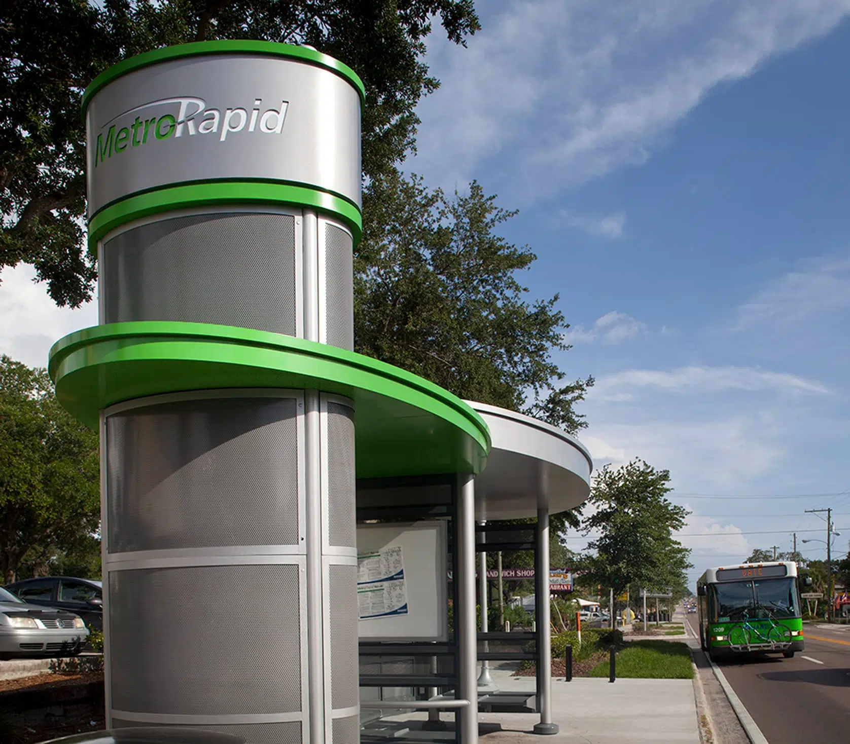 A themed branding separates the MetroRapid system from the local service, and provides an enhanced ridership experience. This includes the choice of a system name, color scheme, logo, and architectural style of the shelter and amenities. All of these differentiate the BRT station from being “just another bus stop” and invites more riders onto the system. The preferred station designs are unique to each location, but each station contains a certain level of amenities designed to enhance ridership, service identity, and provide passenger, pedestrian, and vehicle safety. These amenities include a branded shelter, bicycle racks, BRT-branded totem with route information display, trash receptacles, news kiosks, benches, and additional advertising space at select stations. The total project cost is about $30 million.