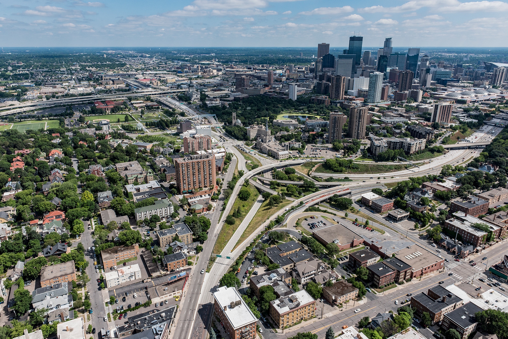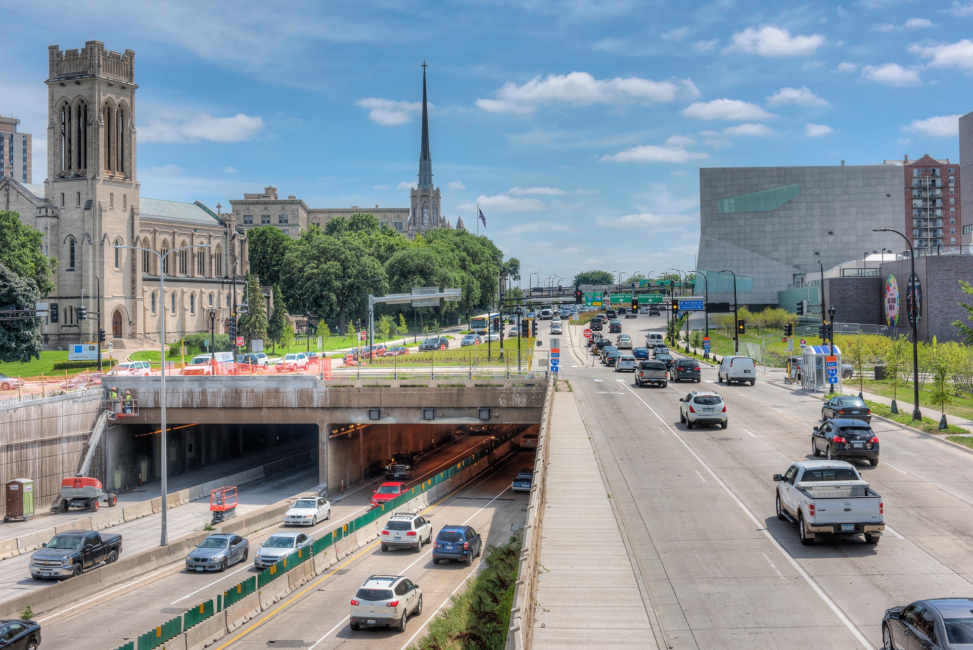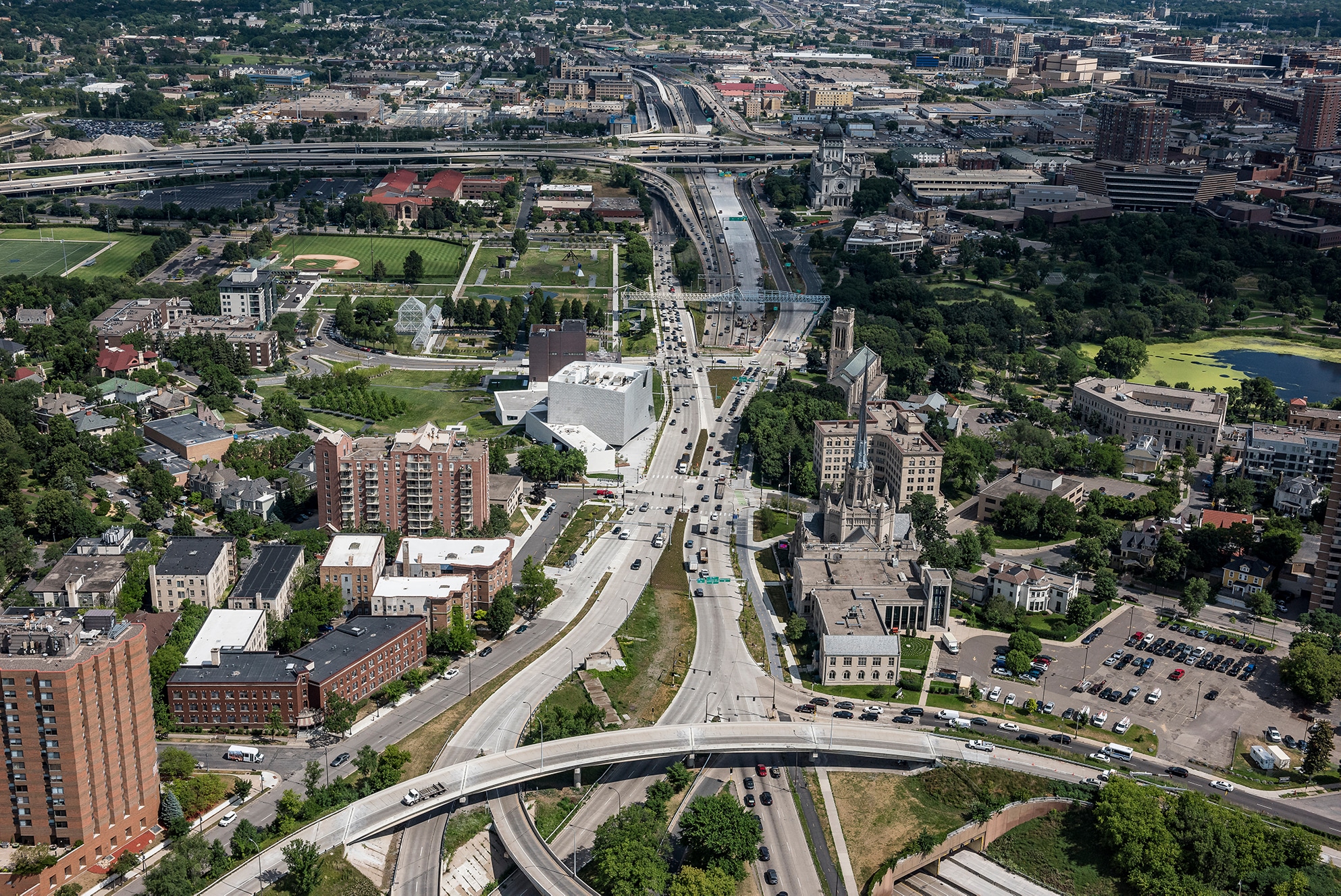 The project was partially financed with Federal Aid funds requiring that the plans and specifications be prepared consistent with MnDOT State Aid/Federal Aid standards. A significant portion of the project improvements were constructed on top of the I-94 Lowry Hill tunnel requiring close coordination with MnDOT. A construction phasing/staging plan was developed to maintain traffic (60,000 average daily traffic) through the project area during construction while maintaining access to the various businesses and institutions along the corridor.