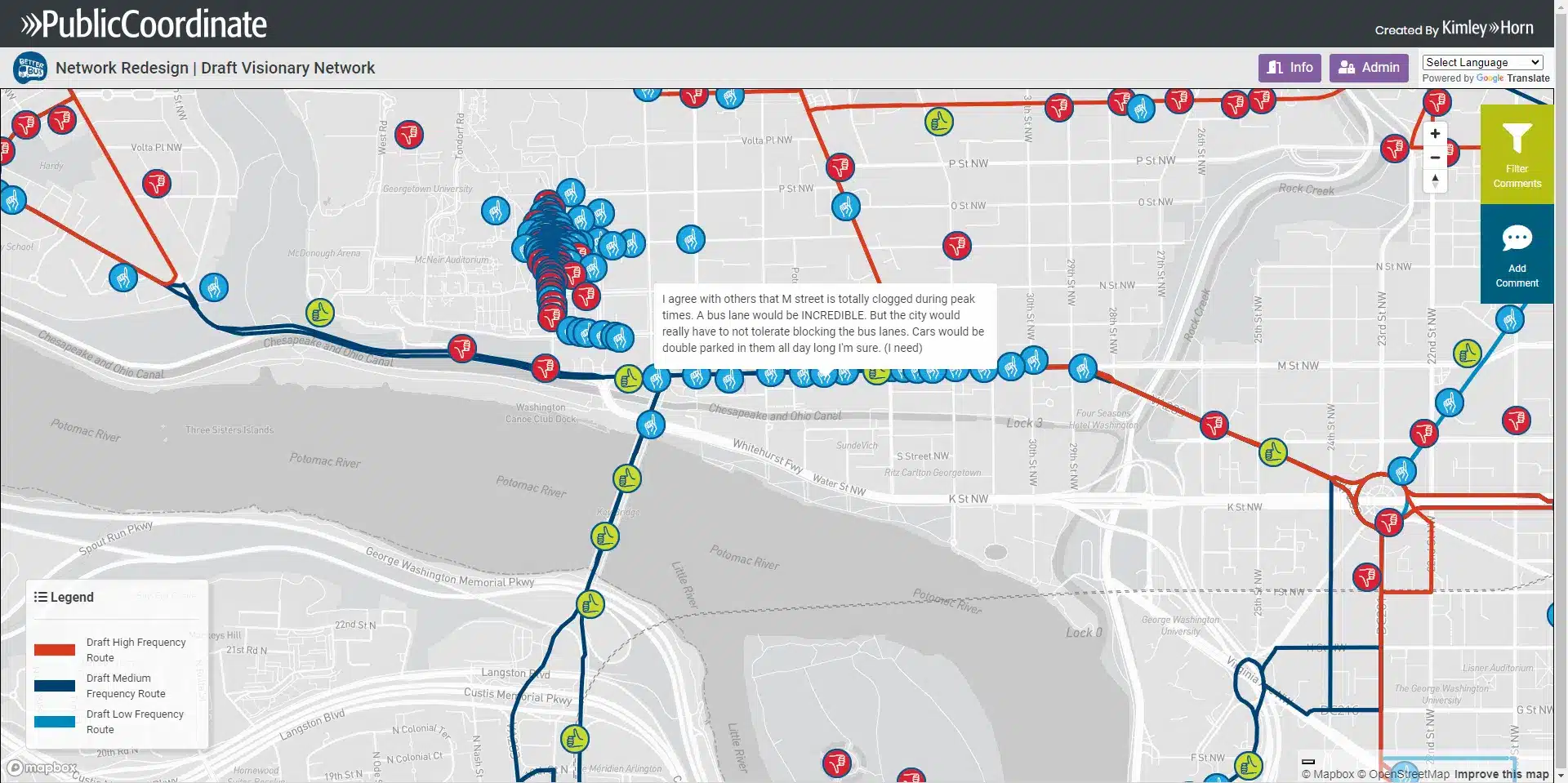 PublicCoordinate, an interactive online software, allowed the public and stakeholders to explore the proposed bus network, compare the proposed changes to the existing routes, and provide feedback all in one view. Commenters were also able to use a drop-down menu to view a route in isolation from the entire network, enabling them to leave comments at specific places in their neighborhoods regarding bus stops, bus lanes, service requests, and more through the “Comment on Your Route” feature. Accessible through a website designed by Kimley-Horn and developed by Cambridge Systematics, PublicCoordinate was identified as an approachable and easy-to-use tool for community engagement.