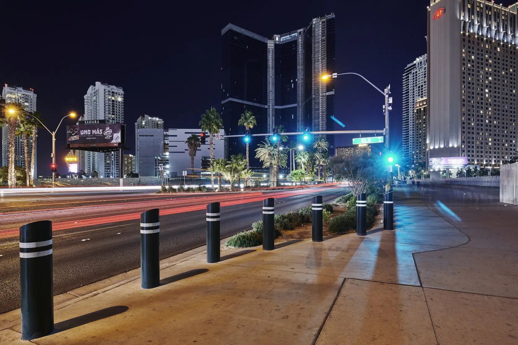 Kimley-Horn assisted Clark County Public Works in the design of high-security pedestrian protection bollards along Las Vegas Boulevard. Pedestrian safety from vehicle intrusions is greatly improved from the “Welcome to Las Vegas” sign to Sahara Avenue. The design of this project included over 5,600 crash-rated bollards, 640 linear feet of crash-rated post and cable protection, and 1,635 linear feet of concrete crash wall, providing over eight total miles of pedestrian protection on this corridor.