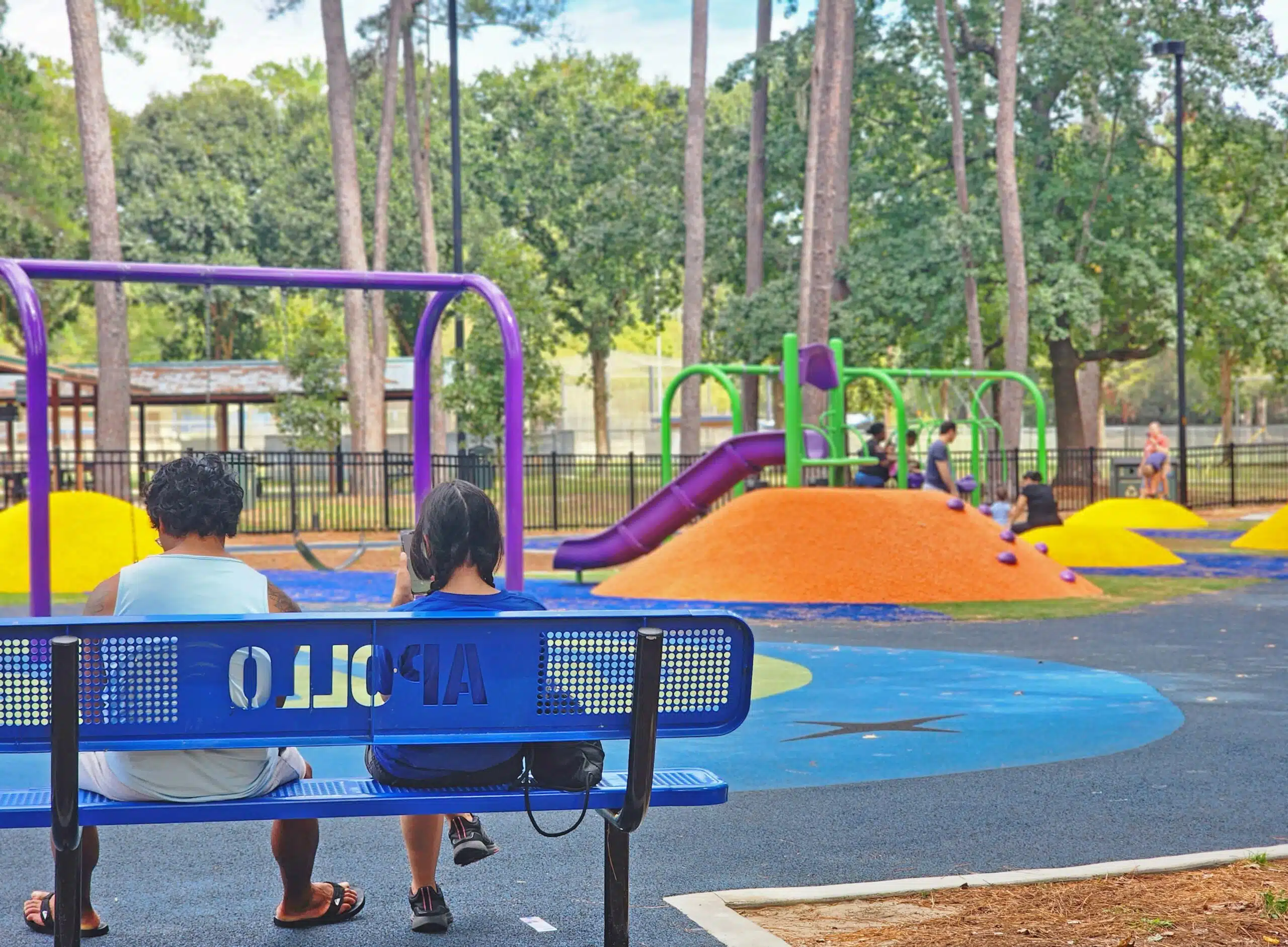 A series of solar system sculptures near Massey Park served as inspiration for the playground’s revitalized theme: space. This concept further captured the team’s desire for the area to be expansive and limitless for all children. Blending practical and creative strategies, Kimley-Horn designed a playground with spaceship- and space station-inspired structures, walkways painted to look like wormholes, and a mound area to mimic extraterrestrial terrain. Even the benches throughout the park are named after space missions—supporting the unified theme that helped integrate the playground into the existing park and surrounding area.