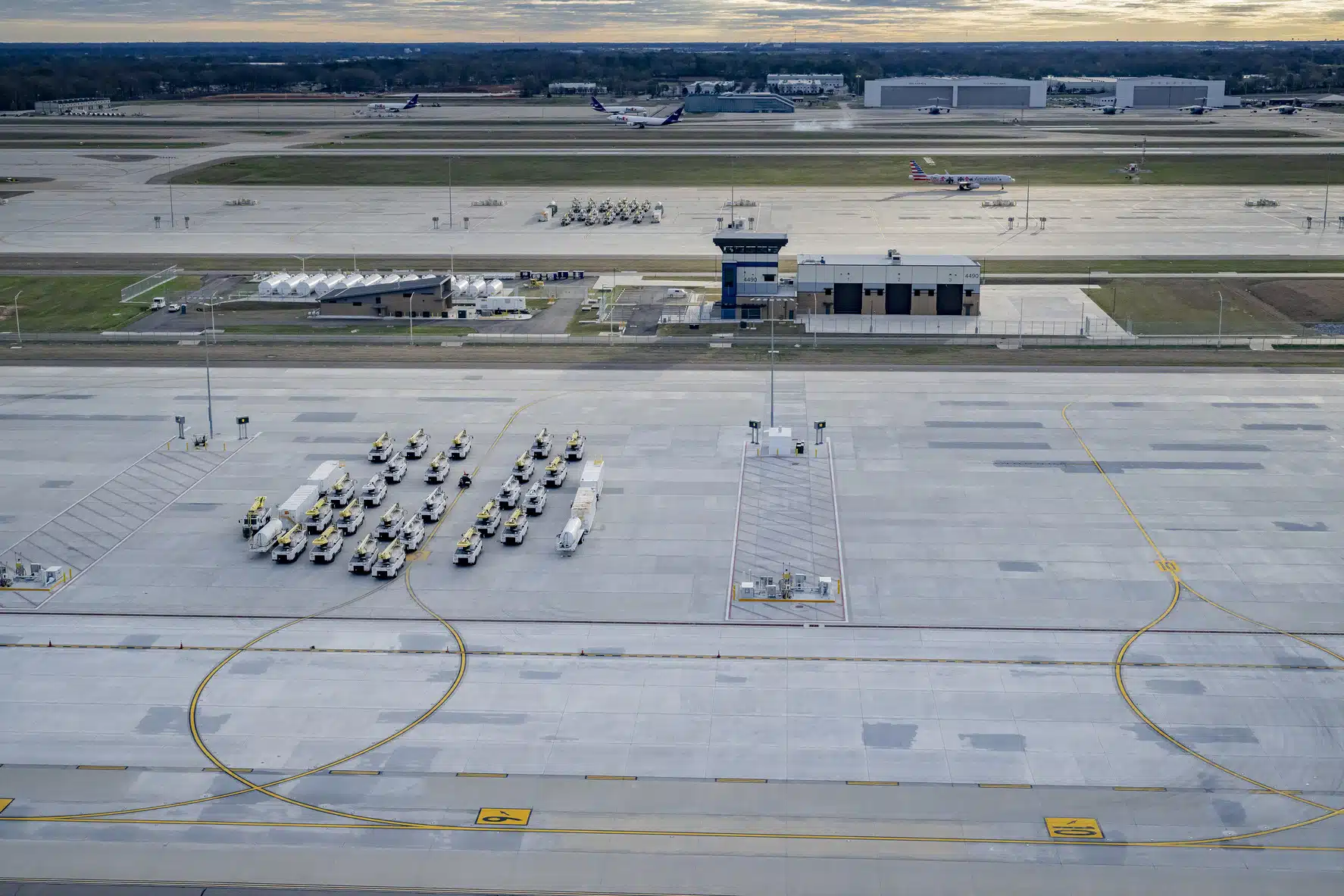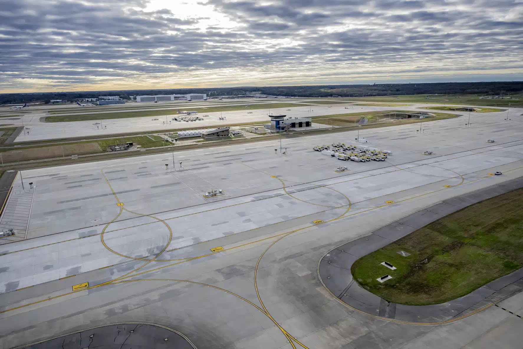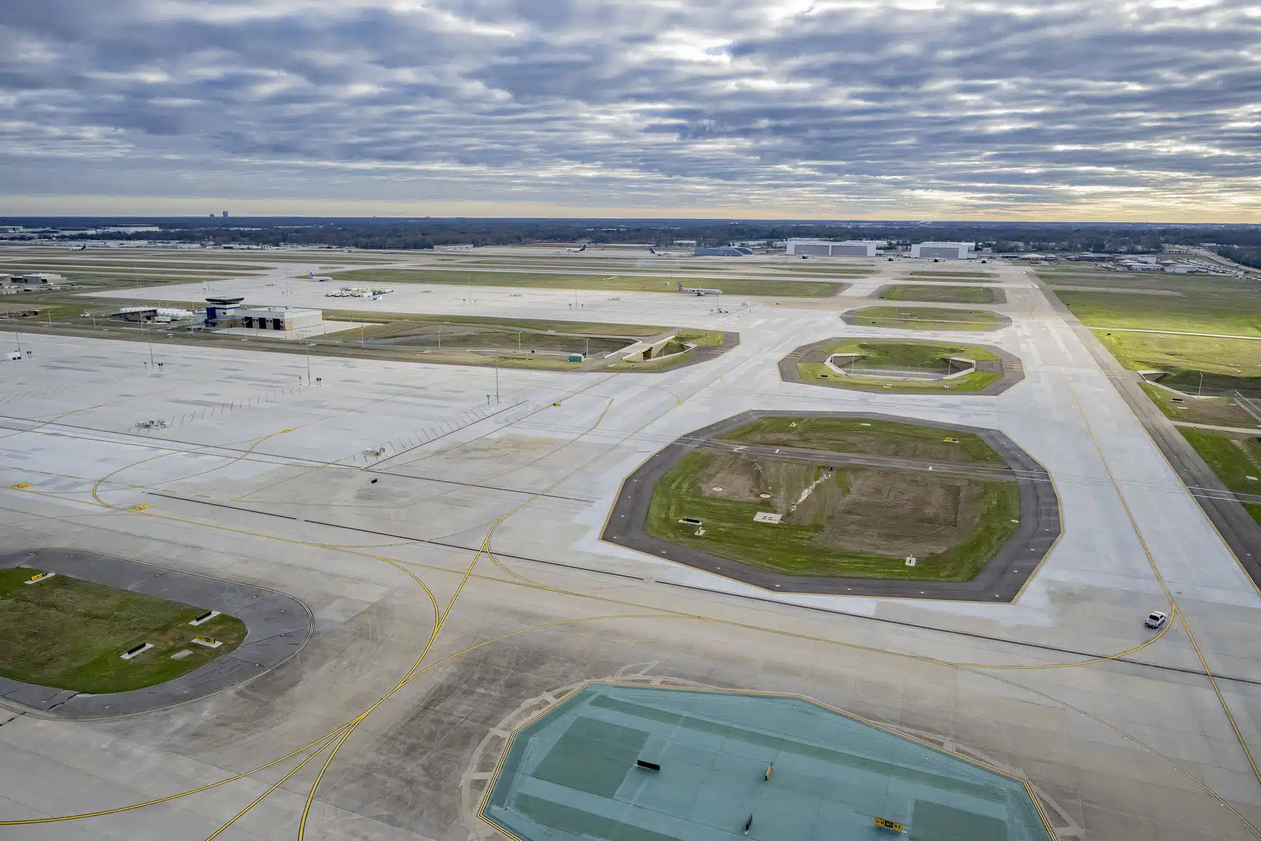 Kimley-Horn provided preliminary and final civil and electrical design of a 12-gate deicing pad on the southern end of the airport and the design of a glycol collection system. The glycol collection systems will temporarily terminate before the existing storm drainage system via a diversion structure that will allow glycol-affected water to be routed to the existing sanitary sewer or pumped out of the drainage system and removed from the site. An electronic bypass option will allow for drainage to continue to the drainage system during periods of no deicing activity.