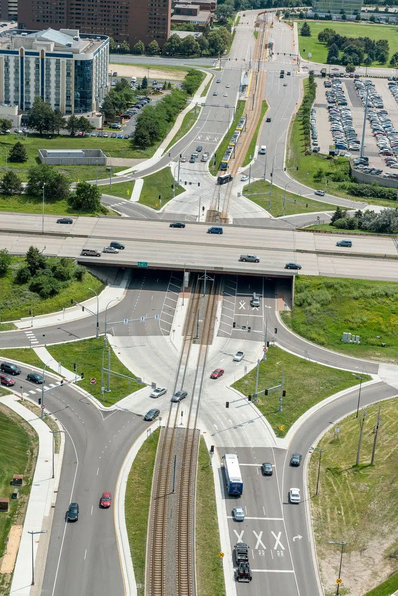 Kimley-Horn led the design and construction support for this project completed by MAC, the City of Bloomington, and the Minnesota Department of Transportation (MnDOT). The project was completed after Kimley-Horn finished a study that recommended roadway improvements as a part of the MSP 2020 Environmental Assessment (EA). The interchange at 34th Avenue South/I-494 was modified to a DDI configuration to reduce the number of potential conflict points and increase capacity within the interchange. This was one of the first DDIs in Minnesota and the first in the U.S. to include Light Rail Transit (LRT). The project involved extensive coordination and collaboration with Metro Transit. Construction was completed in one season, incorporating five phases, with unique traffic control plans designed for each phase. The project also included significant public outreach to communicate LRT shutdowns.