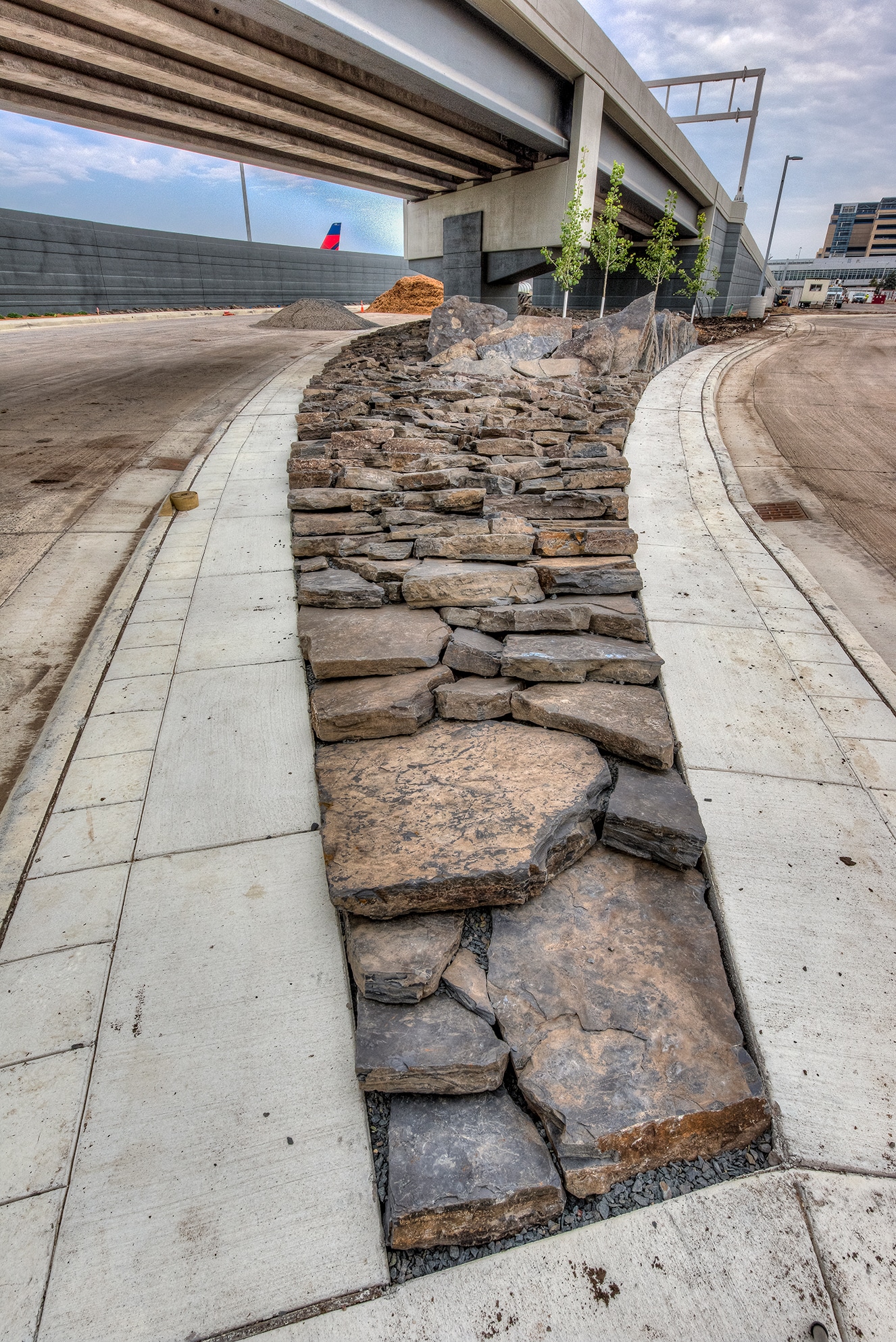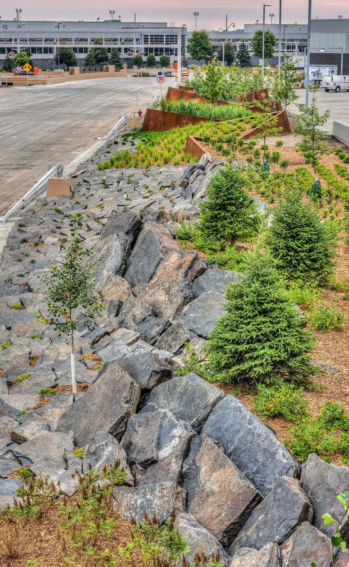 The design story also continues a larger MSP Terminal narrative. The material palette stemmed from a narrative that encouraged Minnesota as a representative landscape. Terminal 2 specifically gathers materials from northern Minnesota, which has been an iron ore extraction center for the United States for a long time. Angular blue-black Virginia slate (an iron mine blasting byproduct) is featured prominently at other points of the terminal, but was found to be too heavy to incorporate the mass and scale successfully into the design. The Virginia slate we used contains traces of iron ore that play out in the stone as bright orange-red streaks. This richness is pulled out further as lighter-weight weathering steel plate, forming a foundational wedge shape in the green roof design. Overhead, the wedges mimic the logic of an agrarian theme by creating a visual similar to a bird’s eye view of planting rows in Minnesota.