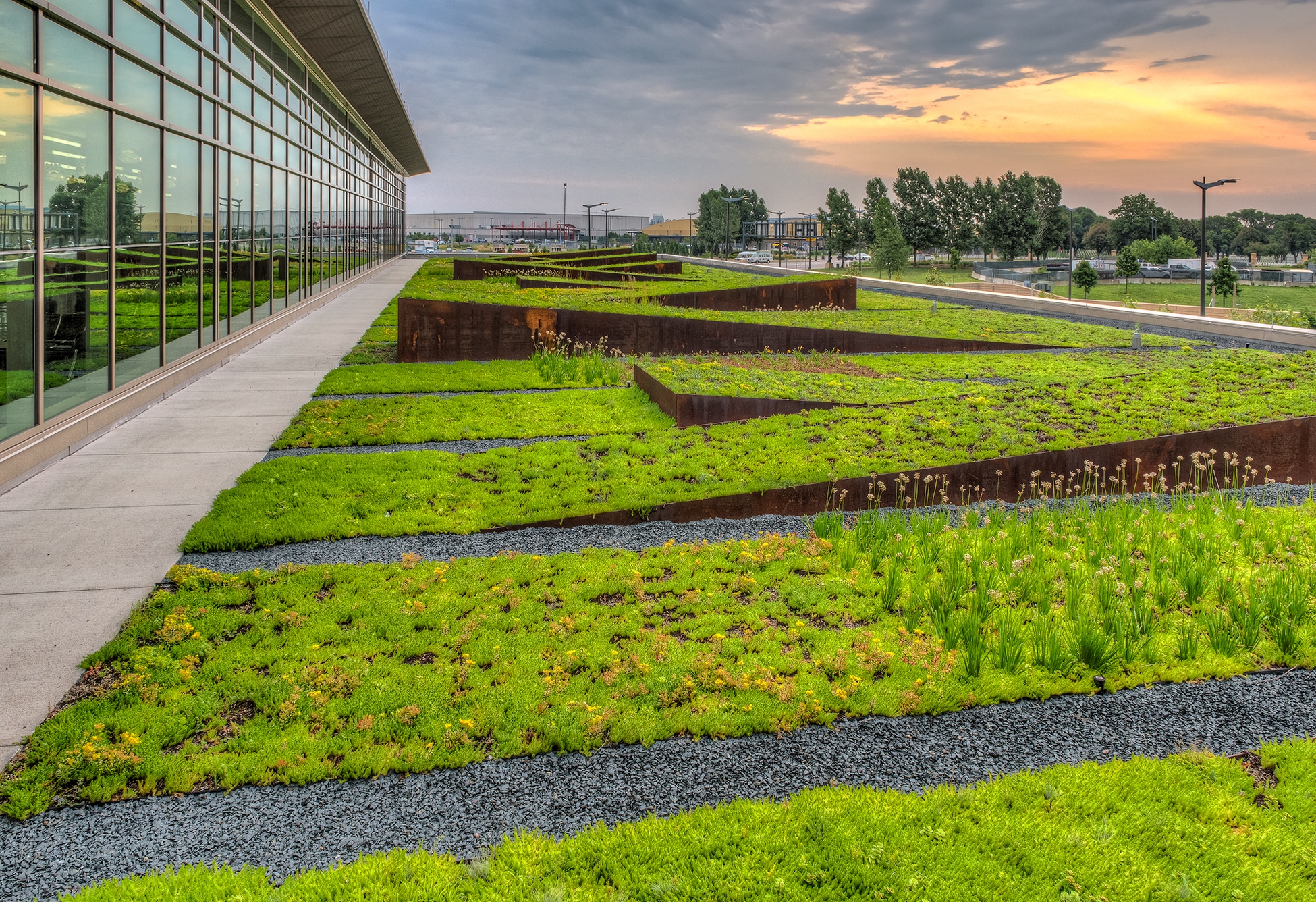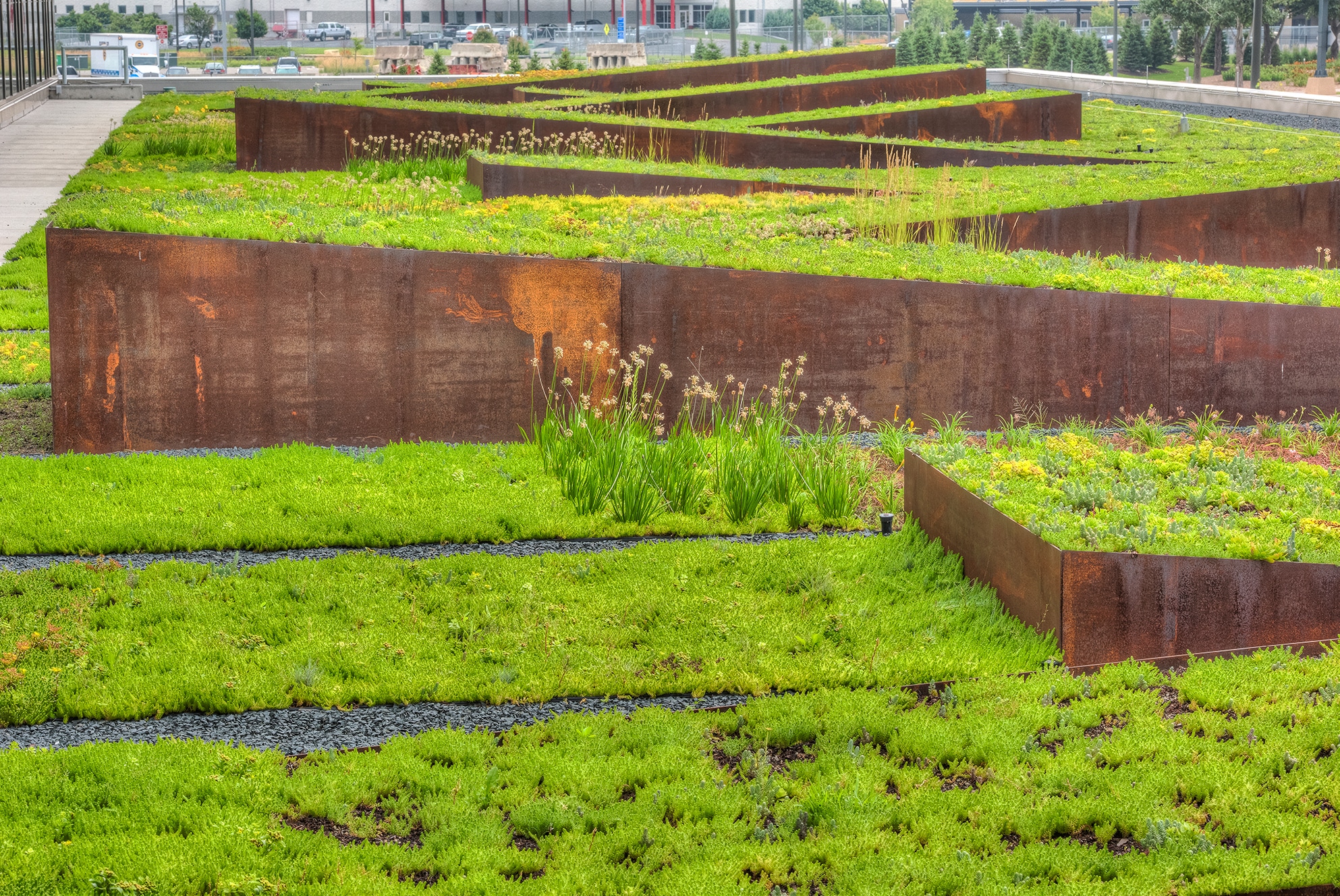 Integral to the gate expansion of Terminal 2 at the Minneapolis-St. Paul International Airport (MSP), a 13,800-square-foot green roof was designed and installed above a baggage handling building. The Metropolitan Airports Commission (MAC) realized the expansion would create an unused, long span of viewable space adjacent to the waiting area. The roof provides a rare opportunity for airport visitors to visually connect with the outdoors as they walk to and wait for their flights. As the first green roof built at MSP, it was important to design not only a dynamic, elevated green space, but one that is maintenance friendly, setting a precedent for future green roofs at MSP.
