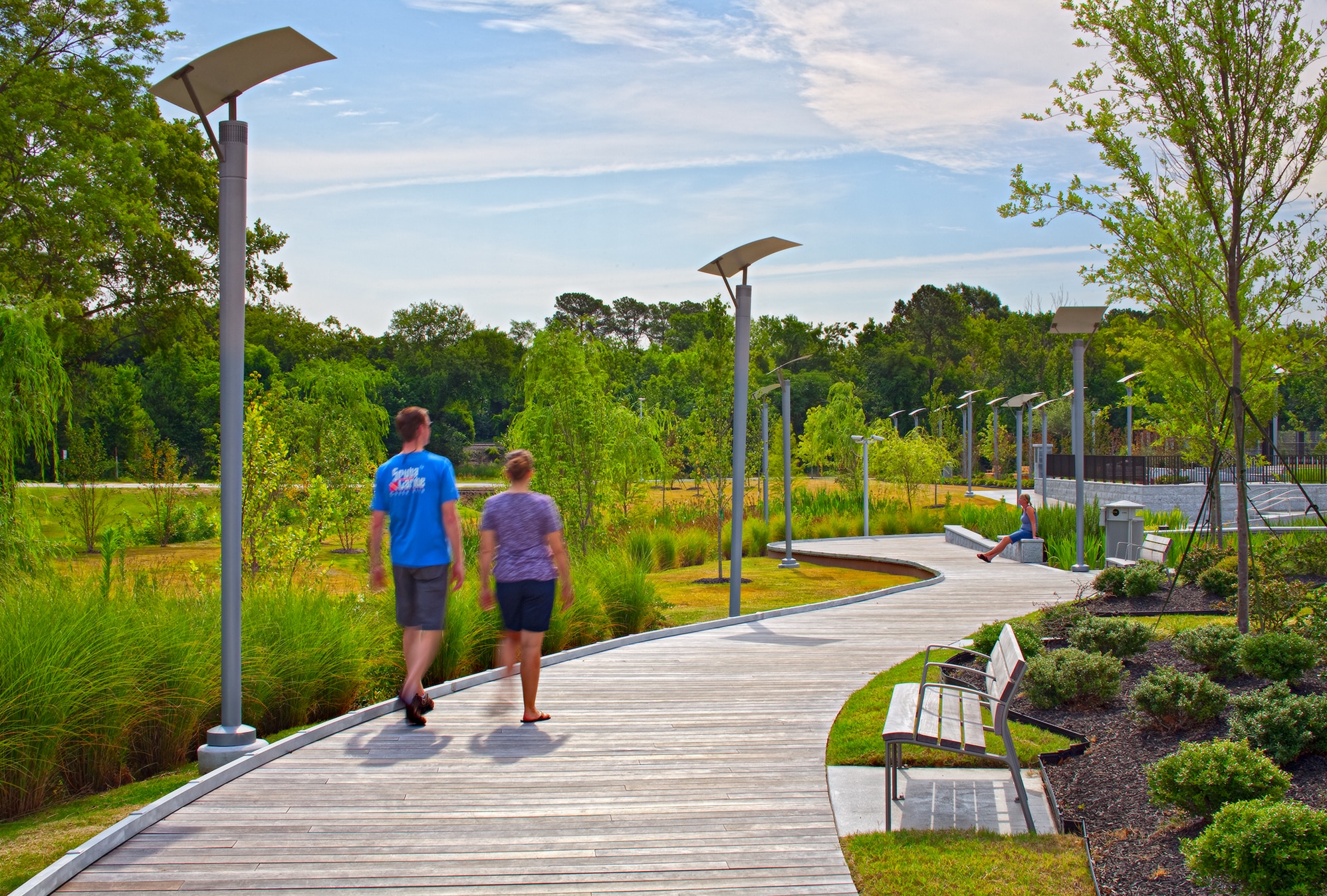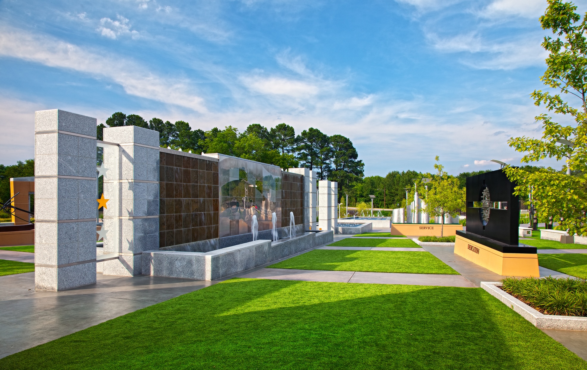 Kimley-Horn collaborated with City staff and private developers, constructing the high-density residential project immediately adjacent, to design a streetscape and trail that complemented the park and integrated into the residential development. Key design elements included decorative concrete sidewalks with etched graphics, retaining walls clad with North Carolina granite, “Guardians of Freedom” markers with granite cladding and LED backlighting, decorative pedestrian lighting, plantings, and an elevated timber boardwalk.