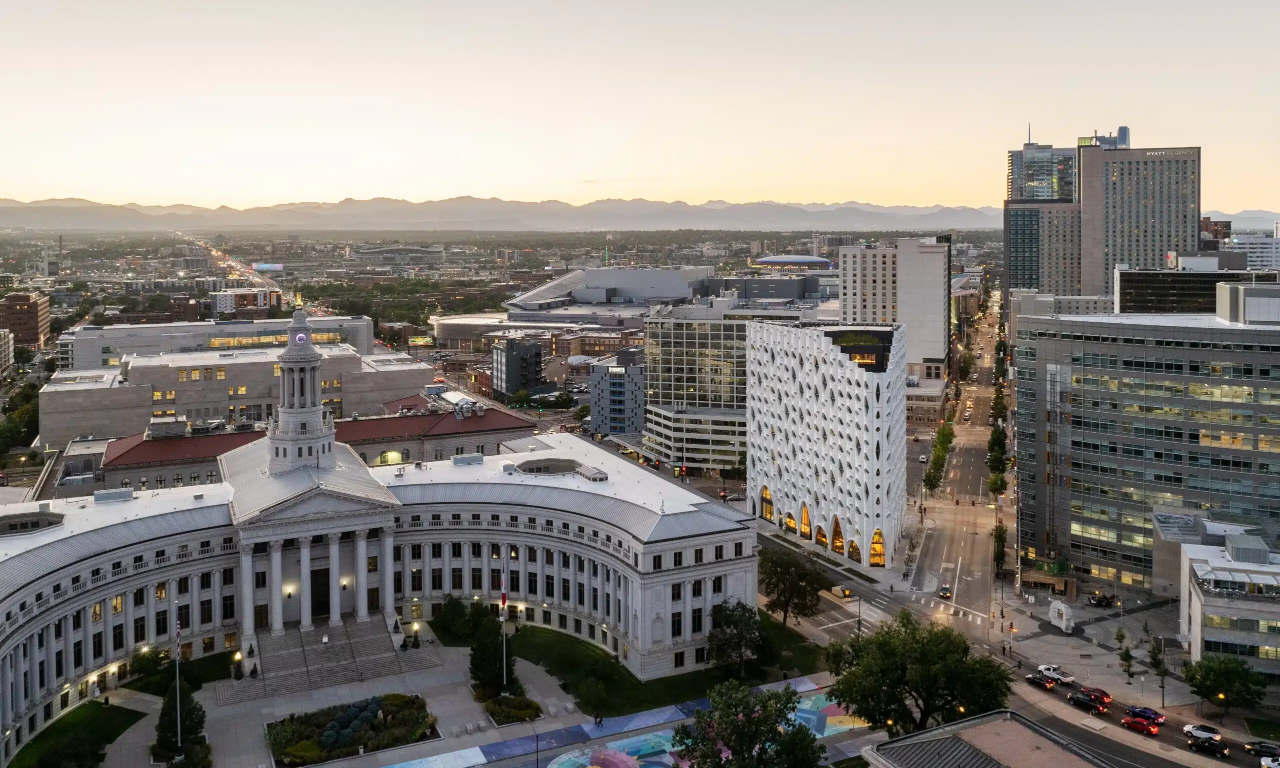 Across from the Colorado State Capitol Building and adjacent to the historic Civic Center Park, Populus Hotel is situated in the heart of Downtown Denver. However, this bustling 13-story building at Colfax Avenue & 14th Street began as an abandoned and impractically sized lot—just under a quarter acre—with a distinctive triangular shape. The lot’s owner, Urban Villages, saw potential in the site as a hotel that could help increase foot traffic to downtown and revitalize the area in the aftermath of the COVID-19 pandemic.