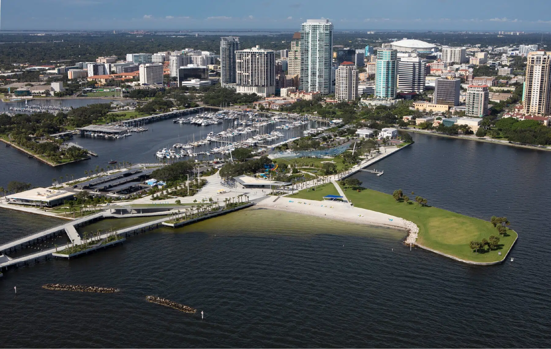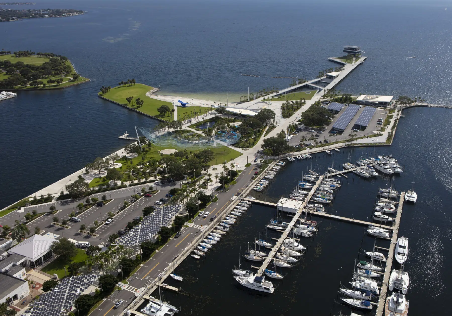 The St. Petersburg Pier (St. Pete Pier) is a unique waterfront attraction and pedestrian-friendly experience that boasts unmatched sightseeing, retail, dining, and entertainment opportunities. This $90 million, 26-acre Pier District fully realizes a master planned vision of an enhanced open space, connecting the shoreline to the downtown core of St. Pete. Kimley-Horn staff from multiple disciplines and offices contributed to the success of this project, involving an unprecedented level of coordination and collaboration among various design teams working together to achieve one unified Pier District.