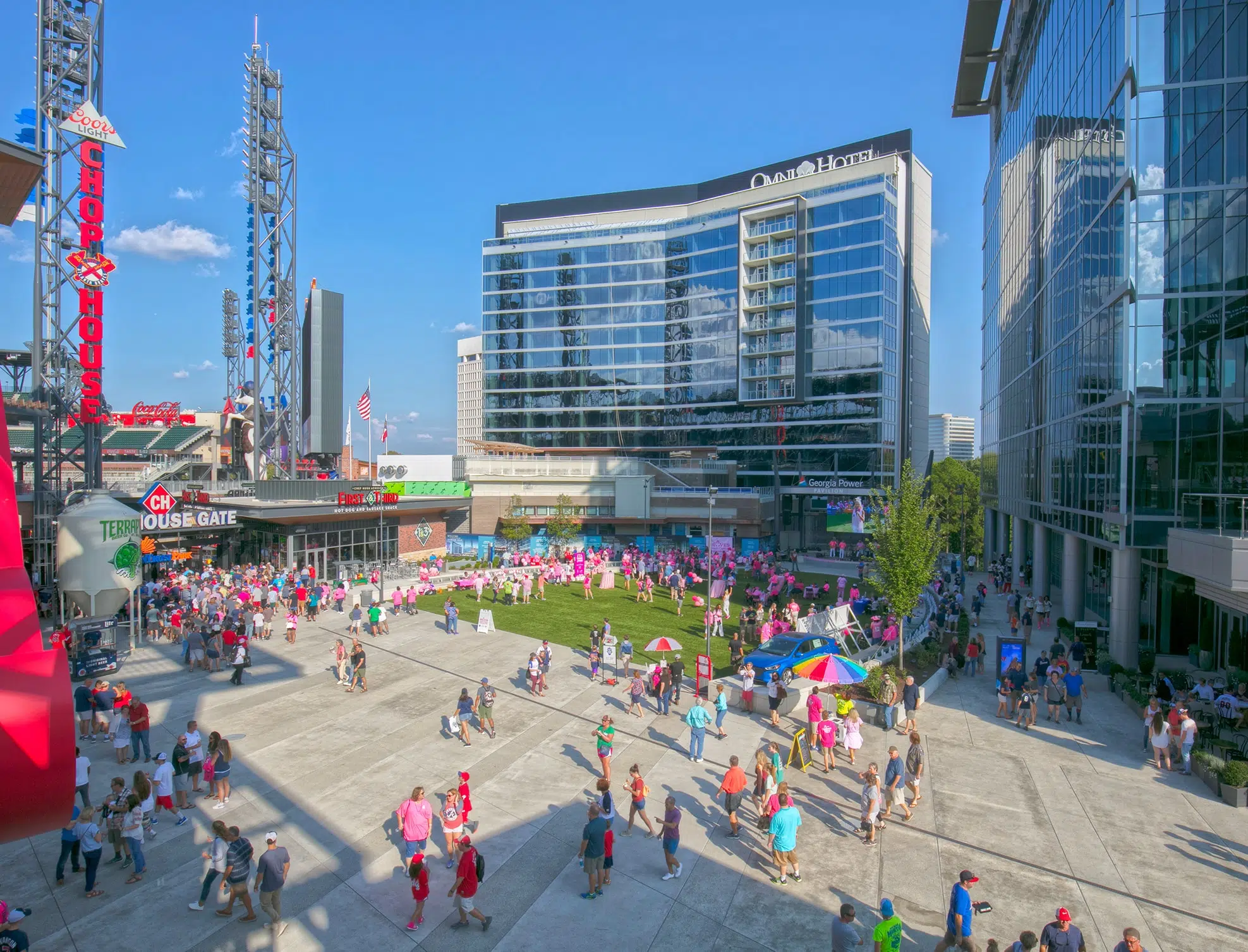 Truist Park and The Battery Atlanta is home to the Atlanta Braves ballpark and is surrounded by a mixed-use development encompassing One Ballpark Center—Comcast’s nine-story regional office headquarters tower; 550 luxury residential units; the 16-level, 260-key Omni Atlanta Hotel; The Coca-Cola Roxy Theater; and retail space that includes 500,000 square feet of both shopping and restaurant and bar attractions. The ballpark has a capacity of 41,676 seats with room for an additional 3,000 standing-room-only patrons. The ballpark and mixed-use project are located on a 57-acre site with a number of outparcels for additional parking and development.
