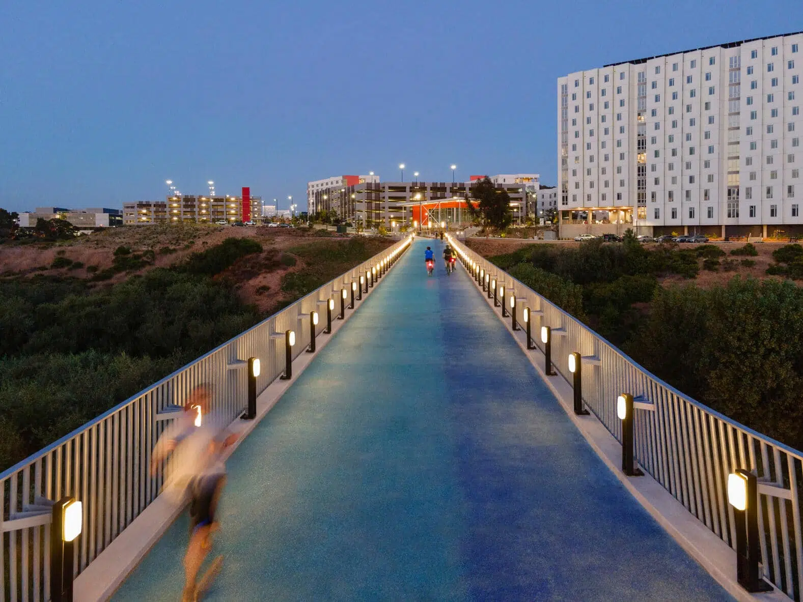 The Bridge is a vital, active transportation connection intended to improve the mobility of those walking and biking between the Mesa Housing Neighborhood and the rest of campus. The bridge serves an essential role for multimodal travel, as the main pedestrian and bike pathway for the entire Mesa Housing Neighborhood to directly access the Medical Center on East Campus and the Gilman Drive Bridge, which connects people to both main campus and the Mid-Coast Trolley.