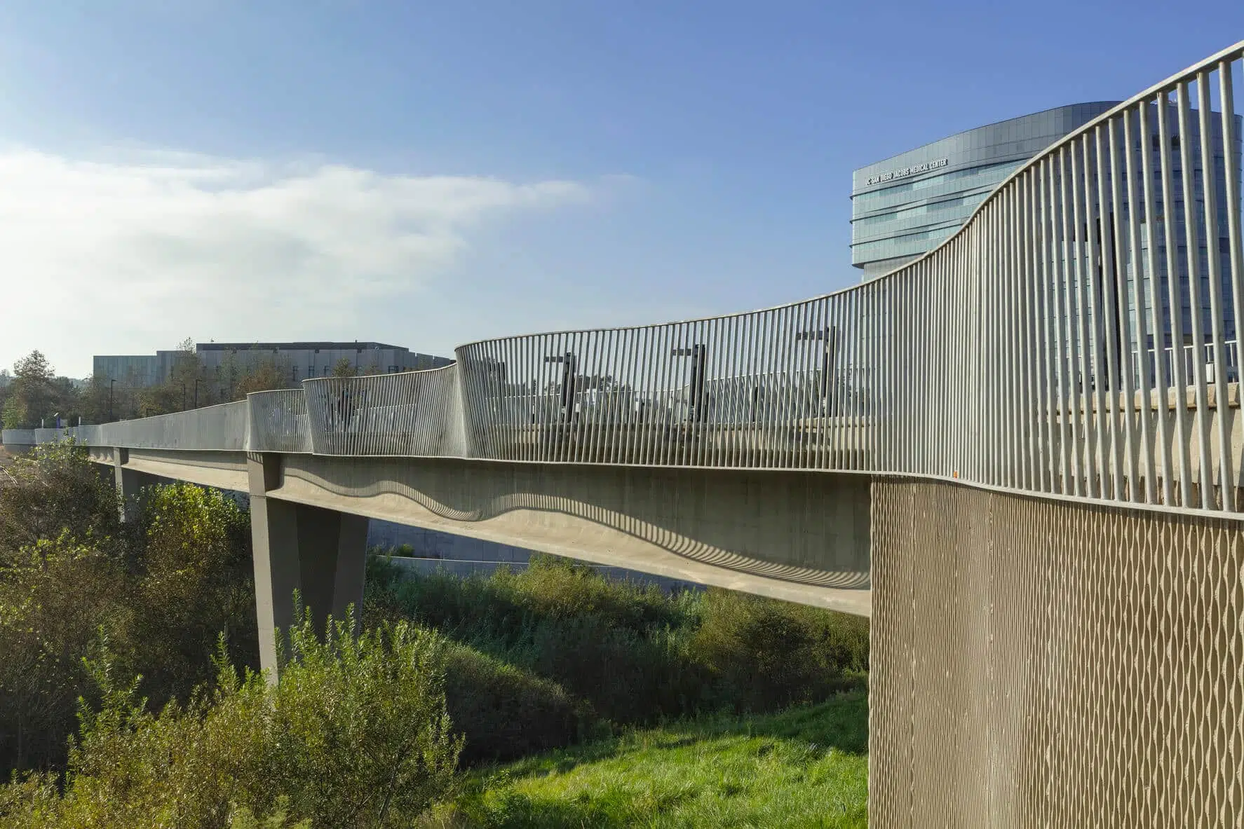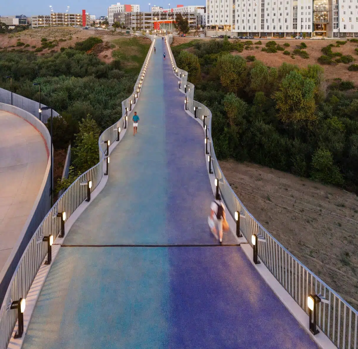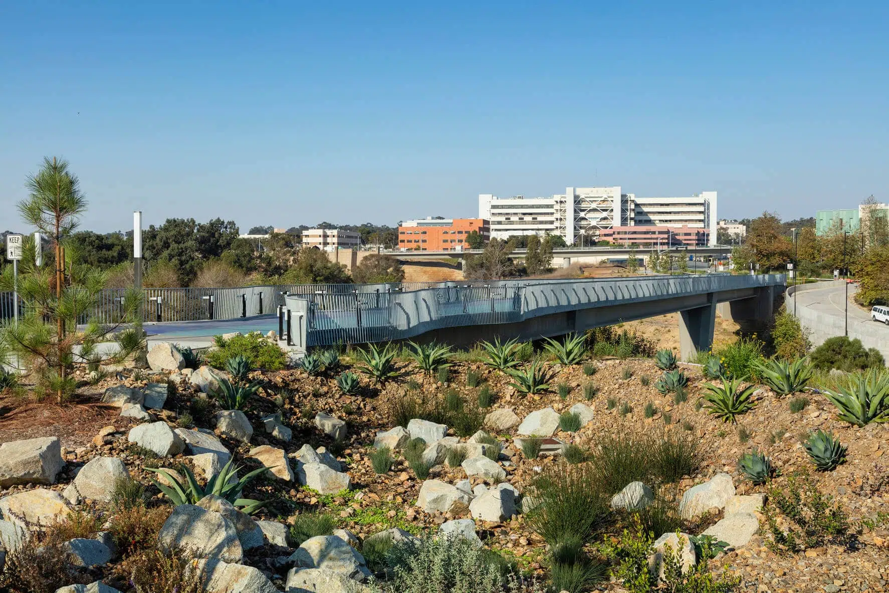 The Bridge is a vital, active transportation connection intended to improve the mobility of those walking and biking between the Mesa Housing Neighborhood and the rest of campus. The bridge serves an essential role for multimodal travel, as the main pedestrian and bike pathway for the entire Mesa Housing Neighborhood to directly access the Medical Center on East Campus and the Gilman Drive Bridge, which connects people to both main campus and the Mid-Coast Trolley.