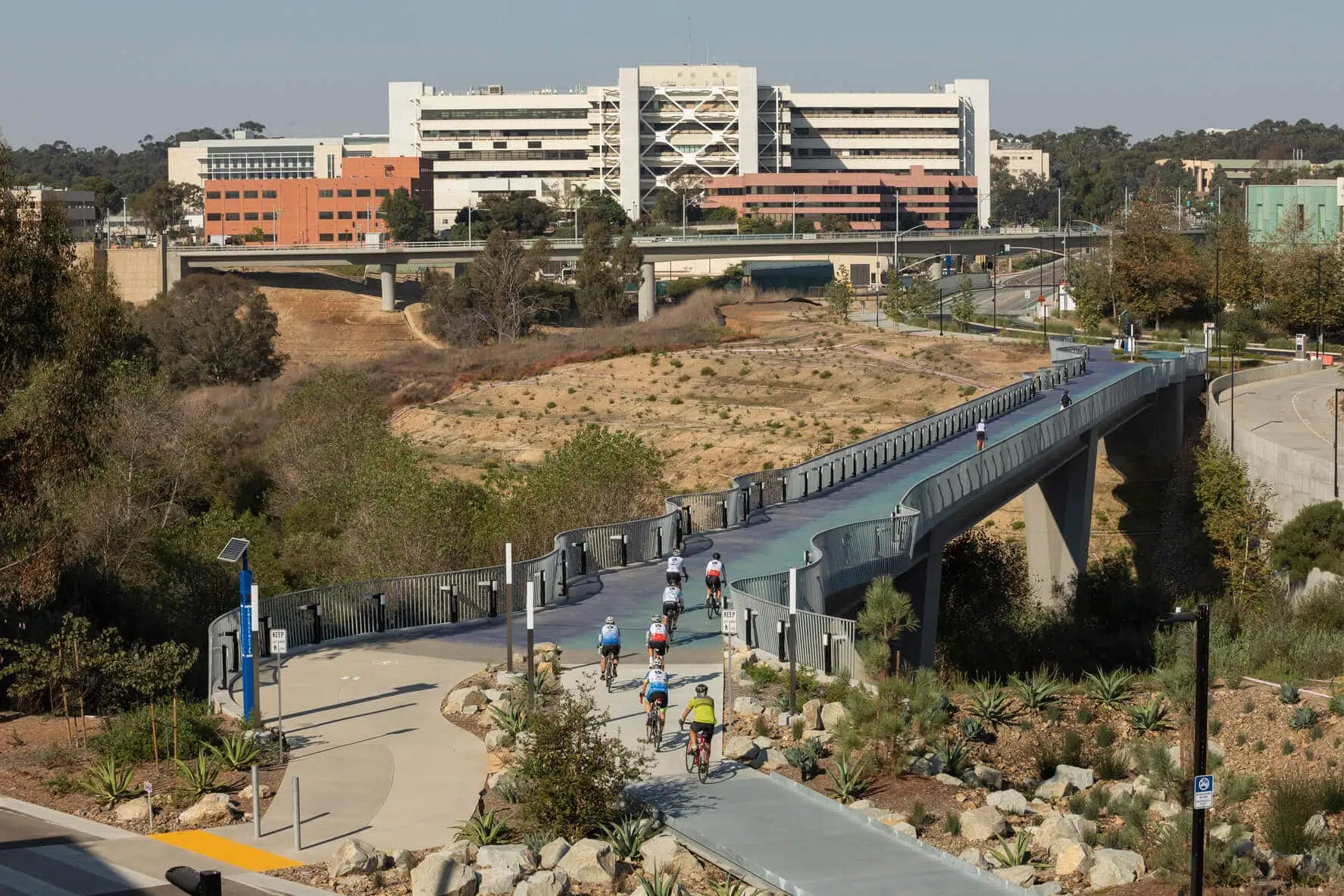 To enhance mobility and improve travel times between Mesa Housing, East Campus Medical Center, and Main Campus at the University of California, San Diego (UCSD), Kimley-Horn provided design services for a new bicycle and pedestrian bridge. This bridge gives a more direct route for pedestrians and cyclists, giving students improved access to campus.