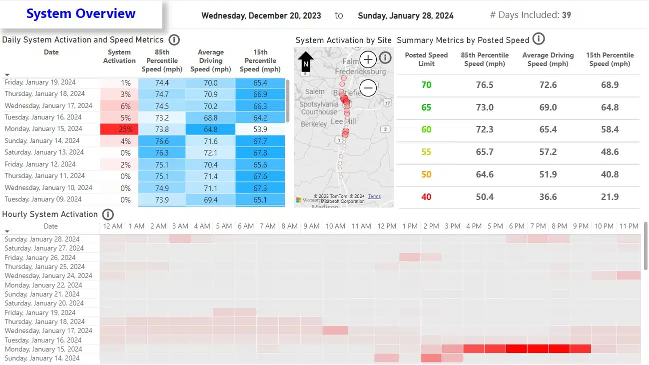 Since launching the system in June 2022, VDOT and the Kimley-Horn team have leveraged the dashboards we built to efficiently monitor system performance. This ability to track driver responses and system functionality has enabled the team to tune algorithm parameters and optimize performance, leading to a robust VSL system that has already changed travel in the region.